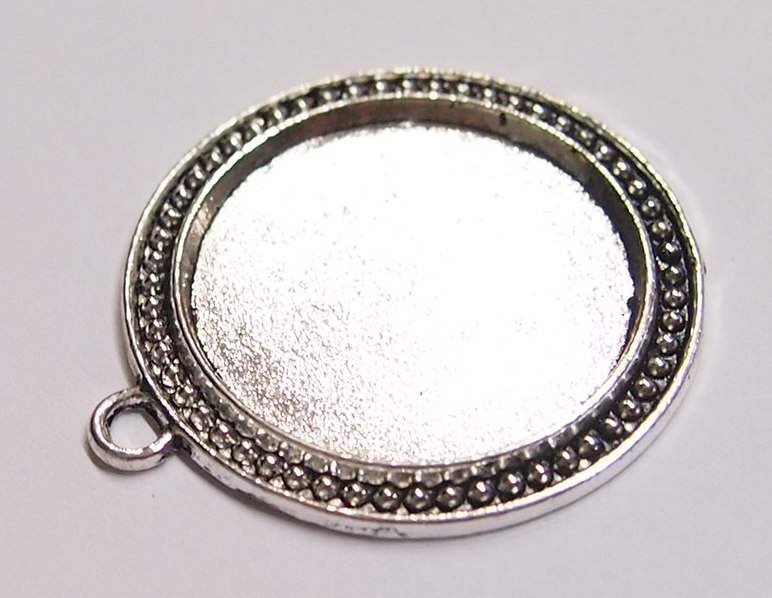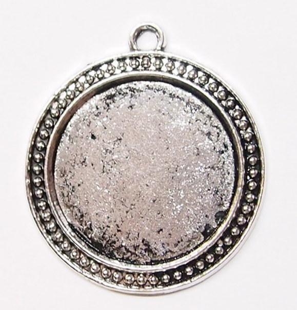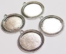 You are buying 4 of 30 mm Round Antique Silver Plated Beaded Pendant Settings. These pendants have a beaded band all around the setting, very nice looking. These are for 30 mm cabs or cameos or coins. Since they are a solid back, you could go down in size a little if you had an odd size cameo or cab to try & fit. The top has a nice size loop (3 mm) for your Chain or Cord or Jump Ring (which I have 3 Colors & 2 Sizes of). Cabs, Cameos, or Coins will have to be glued in, no prongs. I have lots of Great Bails, Bracelets, Cameos, Chains, Connectors, Jump Rings, Lockets, Pendants, Pins, Rings & Settings so, just look at all my listings. I have these in 2 other Colors & in a group of 3 Colors as shown in the last picture item #360815387841. I have lots of other Round Settings & Cameos in several sizes & Colors.