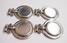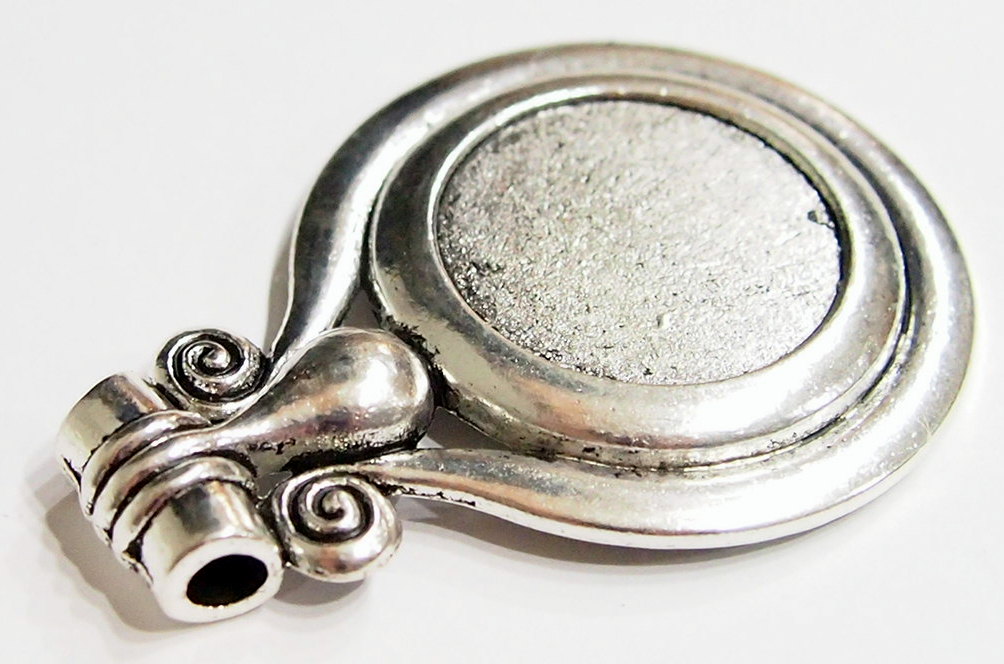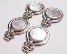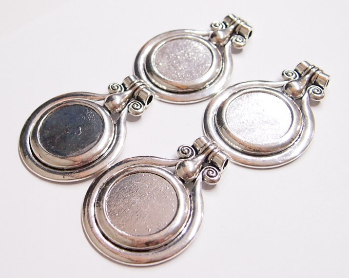 You are buying 4 of 30 mm Round Antique Silver Plated Pendant Settings. These are a very nice size pendant setting measuring 72 mm Long x 52 mm Wide, and has a Tibet or South East Asia look to them. These are great pendant settings & would be awesome for setting Cameos, Cabochons or Coins. The bail is large enough (5 mm) to hold anything you want to put through it. They are for 30 mm cabs or cameos, or Coins but, since they have a solid backing, you could put something smaller in it for those hard to fit cameos, cabochons or coins. I have a lot of 30 mm cameos that will fit these just fine. Cameos, Cabochons, or Coins will have to be glued in, no prongs. I have lots of Great Bails, Bracelets, Cameos, Chains, Connectors, Jump Rings, Lockets, Pendants, Pins, Rings & Settings so, just look at all my listings. I have these in 3 other Colors & in a group of 4 Colors as shown in the last picture item #360495590867, sold separately.