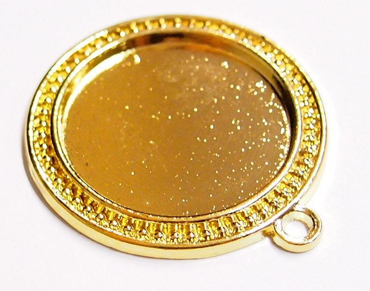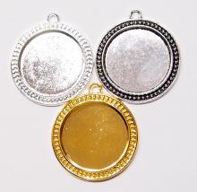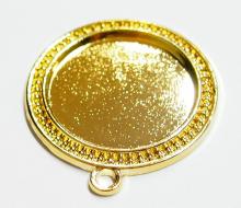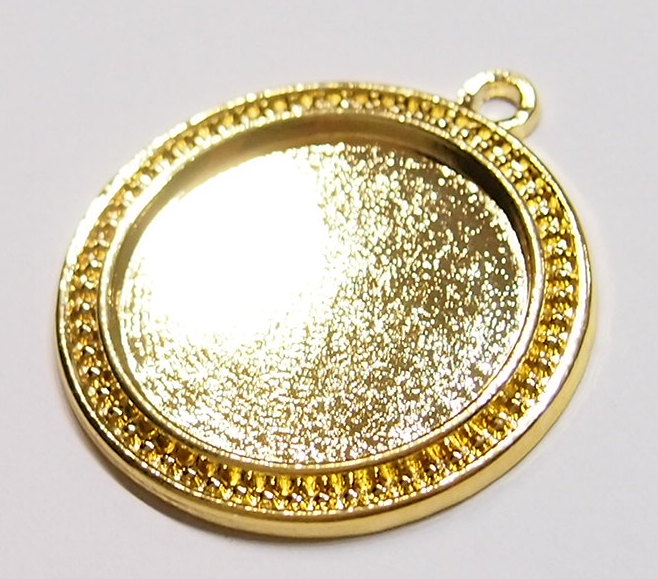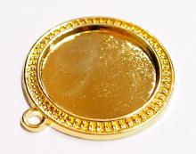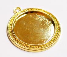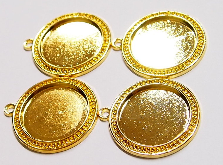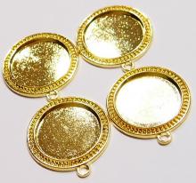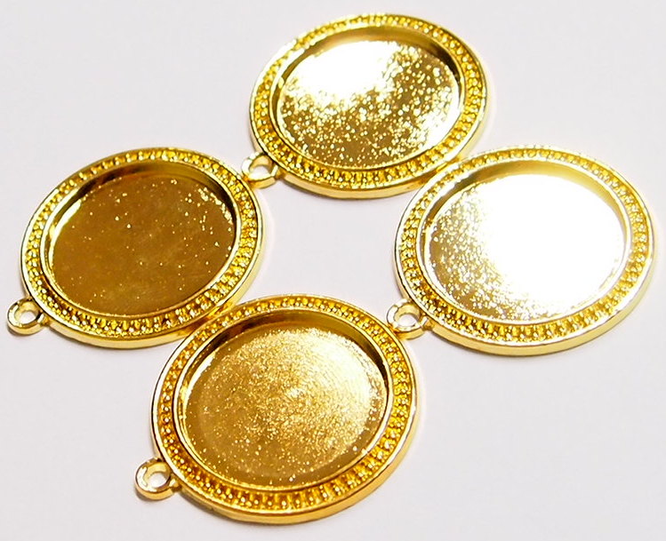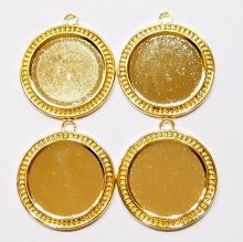 You are buying 4 of 30 mm Round Gold Plated Beaded Pendant Settings. These pendants have a beaded band all around the setting, very nice looking. These are for 30 mm cabs or cameos or coins. Since they are a solid back, you could go down in size a little if you had an odd size cameo or cab to try & fit. The top has a nice size loop (3 mm) for your Chain or Cord or Jump Ring (which I have 3 Colors & 2 Sizes of). Cabs, Cameos, or Coins will have to be glued in, no prongs. I have lots of Great Bails, Bracelets, Cameos, Chains, Connectors, Jump Rings, Lockets, Pendants, Pins, Rings & Settings so, just look at all my listings. I have these in 2 other Colors & in a group of 3 Colors as shown in the last picture item #360815387841. I have lots of other Round Settings & Cameos in several sizes & Colors.