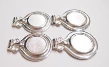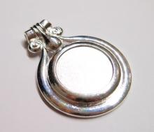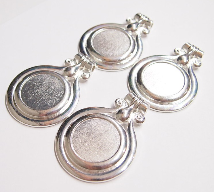 You are buying 4 of 30 mm Round Silver Plated Pendant Settings. This is a nice size pendant measuring 72 mm Long x 52 mm Wide, and has a Tibet or South East Asia look to it. These are great pendant settings & would be awesome for setting Cameos, Cabochons or Coins. The bail is large enough (5 mm) to hold anything you want to put through it. They are for 30 mm Cameos, Cabochons, or Coins but, since they have a solid backing, you could put something smaller on it for those hard to fit cameos, cabs or coins. I have several 30 mm cameos that look great in these. Cameos, Cabochons or Coins will have to be glued in, no prongs. I have lots of Great Bails, Bracelets, Cameos, Chains, Connectors, Jump Rings, Lockets, Pendants, Pins, Rings & Settings so, just look at all my listings. I have these in 3 other Colors & in a group of 4 Colors as shown in the last picture item #360495590867, sold separately.