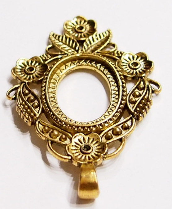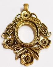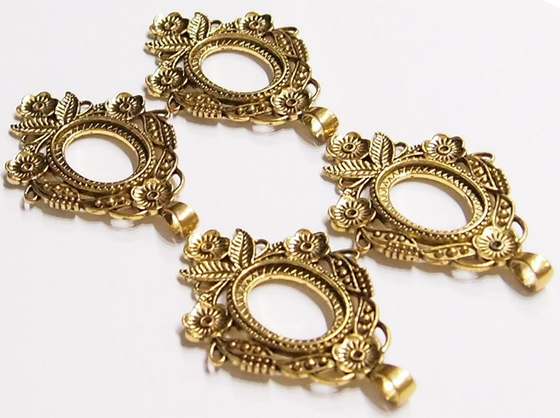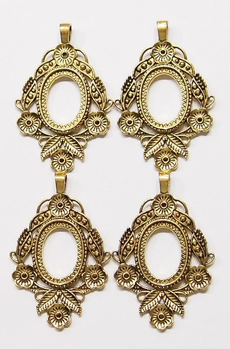 You are buying 4 of 30 mm x 22 mm Antique Gold Plated Victorian Style Floral Pendant Settings. These settings are absolutely gorgeous, it is large (77 mm x 50 mm) with a flower and leaf design, and a big bail too. You will have to glue in any cameos, cabochons, glass, or whatever you want to put into the settings, no prongs and they are very sturdy. These have never been used. These are exactly made for 30 mm x 22 mm. They have a gorgeous Victorian look to them. I have lots of Great Bails, Bracelets, Cameos, Chains, Connectors, Jump Rings, Lockets, Pendants, Pins, Rings & Settings so, just look at all my listings. I have these in 3 other Colors & in a group of 4 Colors as shown in the last picture item #362070414587, sold separately.