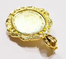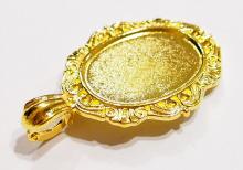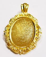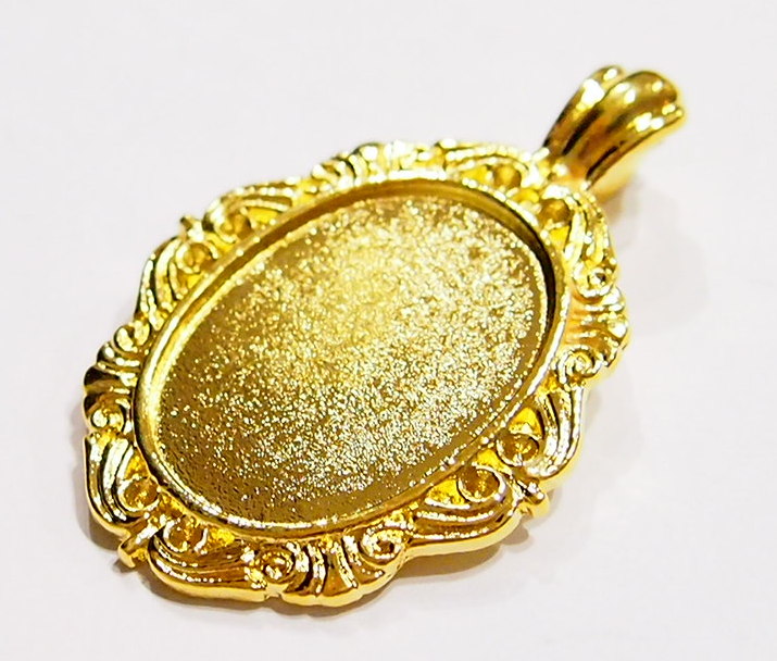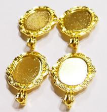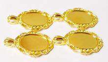You are buying 4 of 30 mm x 22 mm Shiny Gold Plated with Wings around the setting & an Enhancer Bail Pendant Settings. These have enhancers as their bails, very nice & versatile as you can put these over an existing necklace. These settings are originally from the 1900-1930's, I only had a few left and found a company to make these for me & they are Gorgeous. Since they are a solid back, you could go down in size a little if you had an odd size cameo or cab to try & fit. The design is just delicate, but they are very solid, not flimsy like the new ones are. You will not be disappointed in the quality, it is excellent and if I was setting any cameos or cabs, I would use these. These will work great for any cameos or cabs, they will have to be glued in. I have lots of Great Bails, Bracelets, Cameos, Chains, Connectors, Jump Rings, Lockets, Pendants, Pins, Rings & Settings so, just look at all my listings. I have these in 3 other Colors & in a group of 4 Colors as shown in the last picture. I have this same pattern in several sizes of Pendants & Rings.