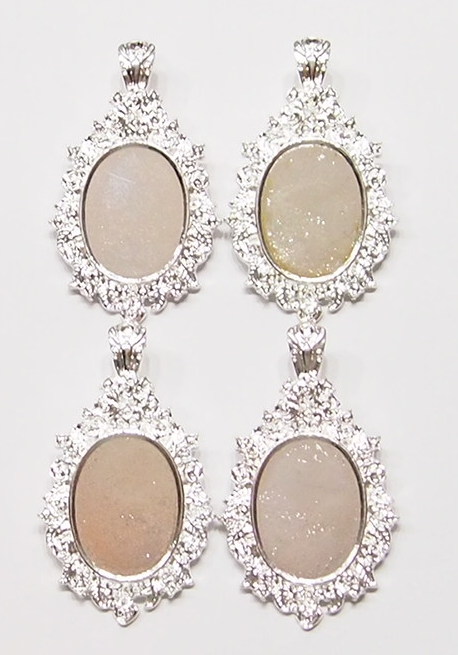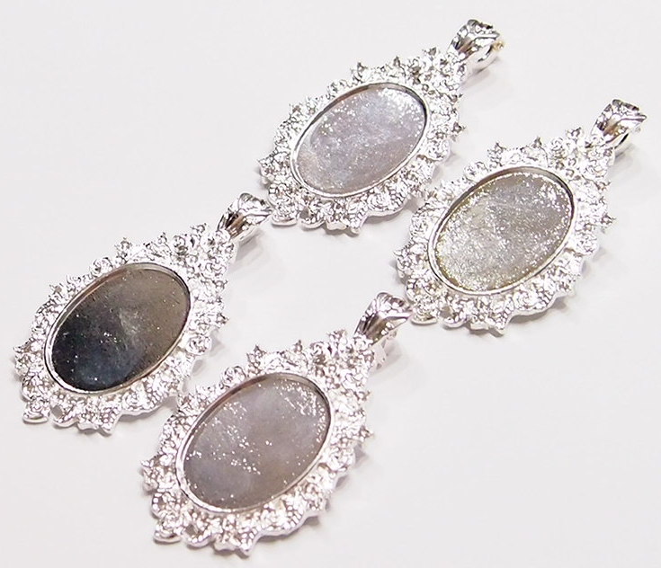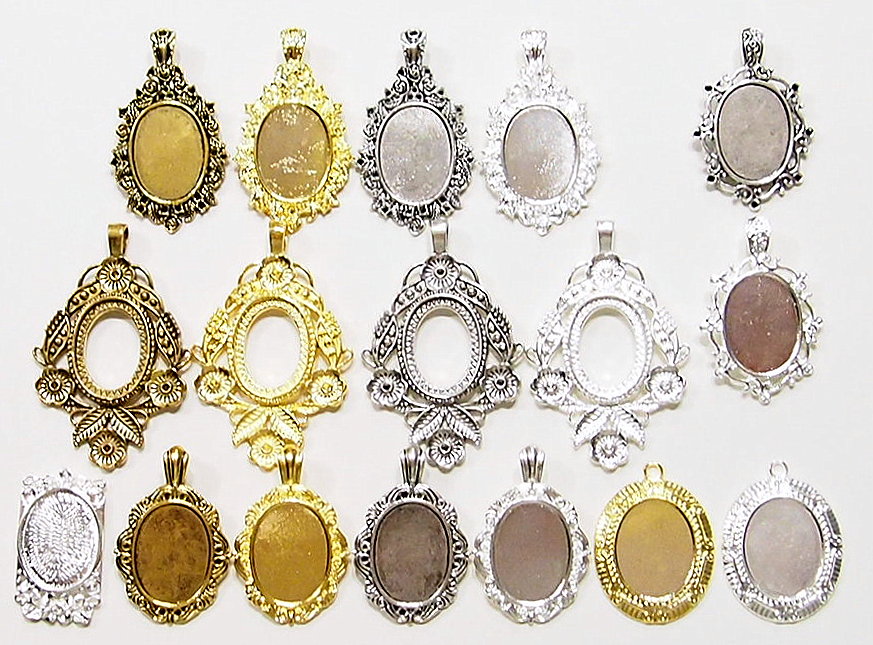 You are buying 4 of 30 mm x 22 mm Shiny Silver Plated Rose & Floral Enhancer Pendant Settings. These have enhancers bails which will open up to put over anything. If you already have a great necklace & want to add a focal or center piece this is the way to do it. This is a Very Nice Feature. I have several pendants that do this. These are very nice size settings (65 mm x 39 mm Outer Dimensions) and they have a very intricate and gorgeous design of roses and leaves all around the outside of the setting. Also with these are several places you could put crystals or stones if you wanted or leave them the way they are which is just gorgeous. These settings are originally from the 1900-1930's, I only had a few left and found a company to make these for me and they are gorgeous. The design is just delicate, but they are very solid, not flimsy like the new ones are. You will not be disappointed in the quality, it is excellent and if I was setting any cameos, cabochons, or glass, I would use these. These will work great for any cameos or cabs, they will have to be glued in. I have lots of Great Bails, Bracelets, Cameos, Chains, Connectors, Jump Rings, Lockets, Pendants, Pins, Rings & Settings so, just look at all my listings. I have these in 3 other Colors & in a group of 4 Colors as shown in the next to last picture item #360926605856, sold separately. I also have a group of 17 different 30x22 mm settings as shown in the last picture item #360471675911, sold separately.