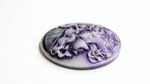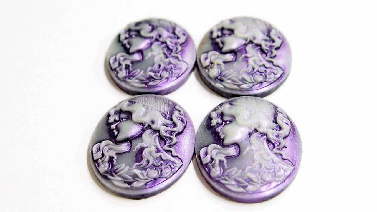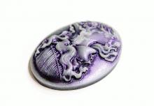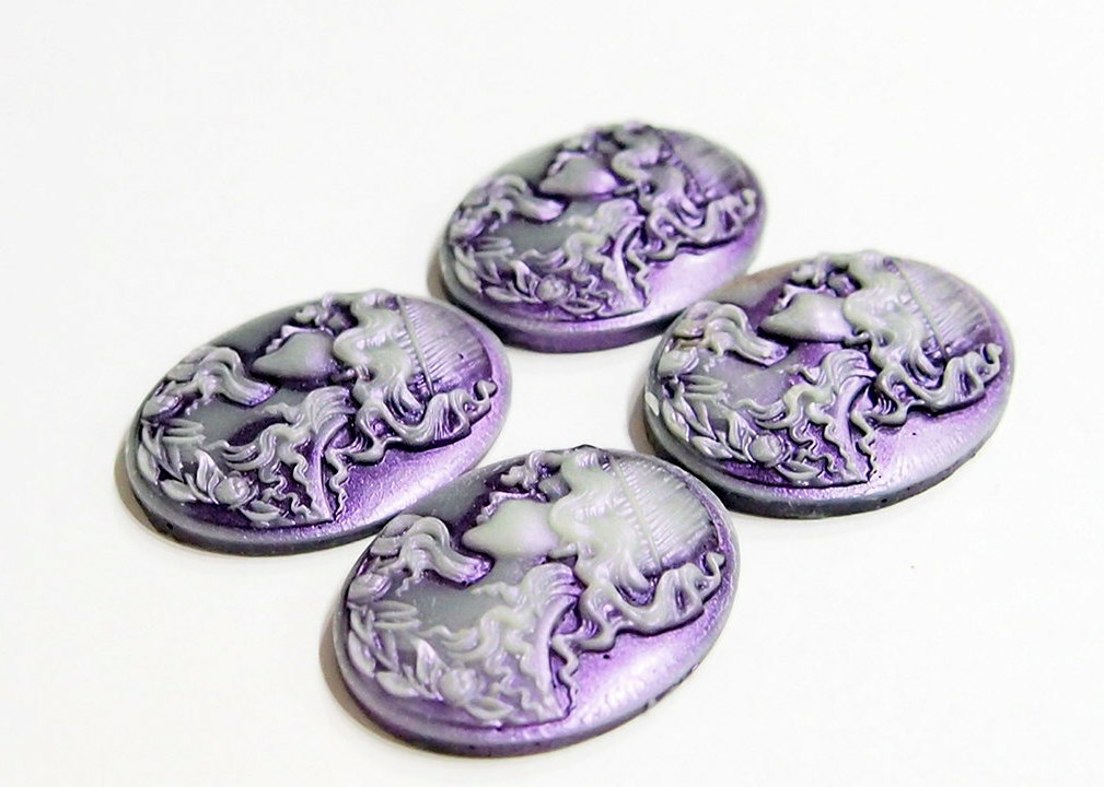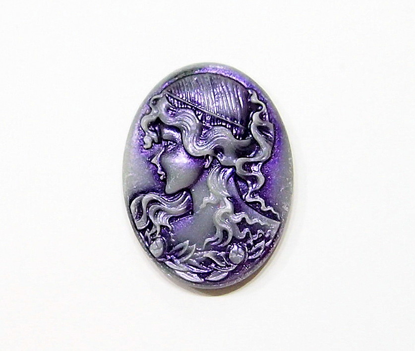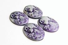 You are buying 4 of 38 mm x 29 mm White into Purple Wavy Hair Left Facing Woman Cameos. These are so gorgeous, this shows a Flapper lady, facing left with a cool flapper style hat on over her head of curls. She also has floral accents too, they are perfect. The girl is White that fades into a gorgeous Purple background. These actually measure 38 mm x 29 mm, since they are a little under sized you will have to center them in whatever you are setting them in. I have several different settings these will fit in. They look very detailed for their size. I have lots of Great Bails, Bracelets, Cameos, Chains, Connectors, Jump Rings, Lockets, Pendants, Pins, Rings & Settings so, just look at all my listings. I have these in 3 other Colors & in a group of 4 Colors as shown in the last picture item #360471675603, sold separately.