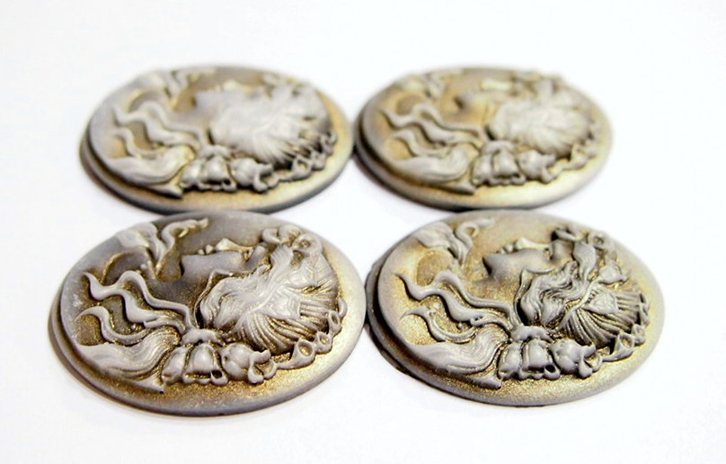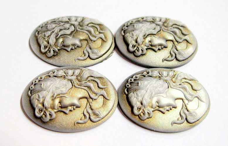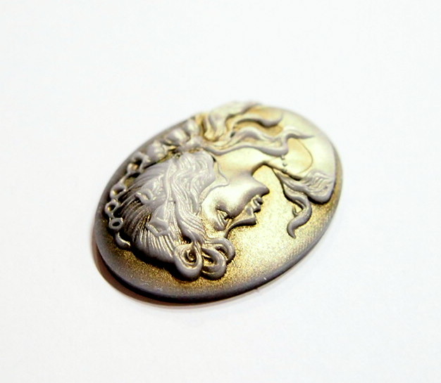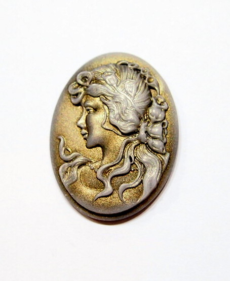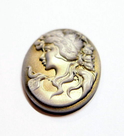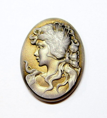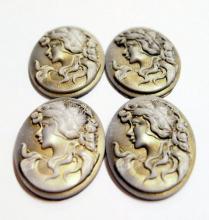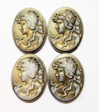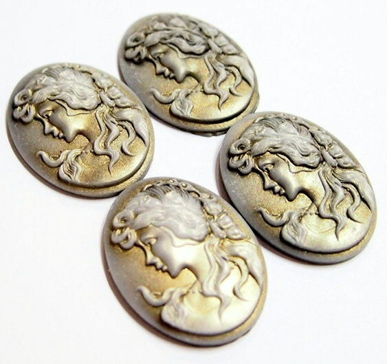 You are buying 4 of 39 mm x 29 mm White over Gold Left Facing Long Haired Woman Cameos. These are so gorgeous, this shows a lady, facing left with a her long hair flowing all around her face and neck. She is White that fades into Gold highlights, mixed up bronze color background, very unusual. I have several different settings these will fit in to. Even though they measure 39 mm x 29 mm, they fit perfectly into a 40 mm x 30 mm.These are an older cameo. They look very detailed for their size. I have lots of Great Bails, Bracelets, Cameos, Chains, Connectors, Jump Rings, Lockets, Pendants, Pins, Rings & Settings so, just look at all my listings. I have these in 3 other Colors & in a group of 4 Colors.