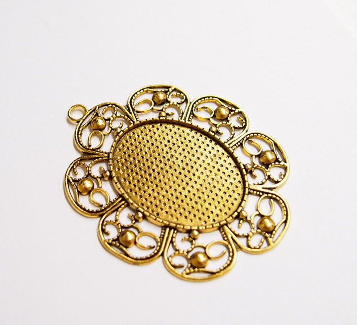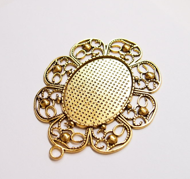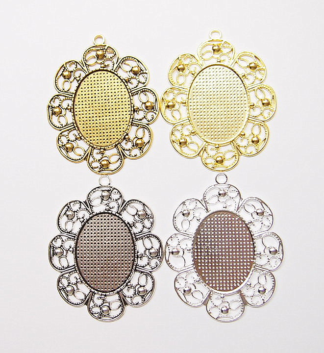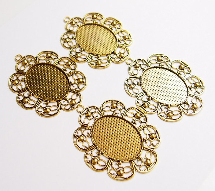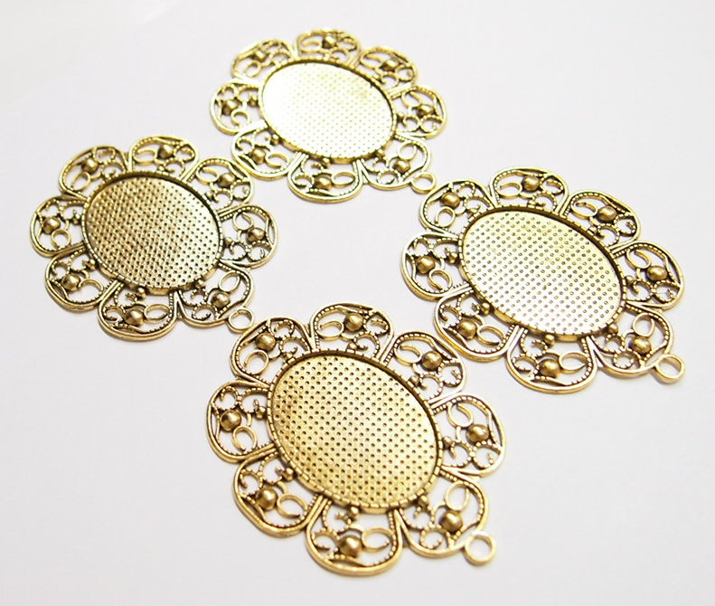 You are buying 4 of 40 mm x 30 mm Antique Gold Plated Flowered Pendant Settings. These settings are originally from the 1900-1930's, I only had a few left and found a company to make these for me and they are gorgeous. The design is just delicate, but they are very solid, not flimsy like the new ones are. These measure 75 mm x 60 mm including the loop at the top. The top has a nice size loop (5 mm) for your Chain or Cord or Jump Ring (which I have 3 Colors & 2 Sizes of). You will not be disappointed in the quality, it is excellent and if I was setting any cameos or cabs, I would use these. Since they are a solid back, you could go down in size a little if you had an odd size cameo or cab to try & fit. These will work great for any cameos or cabs, they will have to be glued in. I have lots of Great Bails, Bracelets, Cameos, Chains, Connectors, Jump Rings, Lockets, Pendants, Pins, Rings & Settings so, just look at all my listings. I have these in 3 other Colors & in a group of 4 Colors as shown in the third from last picture item #111863818109. This setting is included in a group of 12 different Antique Gold settings as shown in the next to last picture item #112623140693 and the very same group is offered in Antique silver item #361475160163 as shown in the last picture, sold separately.