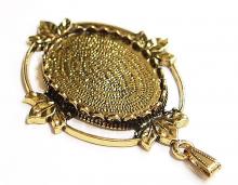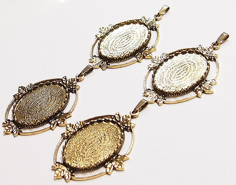 You are buying 4 of 40 mm x 30 mm Antique Gold Plated Old Style Scallop & Leaf Pendant Settings. These settings are originally from the 1900-1940's, I only had a few left and found a company to make these for me and they are gorgeous. These have a bail and are glue in settings. The design is just delicate, but they are very solid, more sturdy than the old ones, with a scallop edge around the settings and a 4 leaf design. You will not be disappointed in the quality, it is excellent and if I was setting any cameos or cabs, I would use these. Since they are a solid back, you could go down in size a little if you had an odd size cameo or cab to try & fit. I have lots of Great Bails, Bracelets, Cameos, Chains, Connectors, Jump Rings, Lockets, Pendants, Pins, Rings & Settings so, just look at all my listings. I have these in 3 other Colors & in a group of 4 Colors as shown in the third from last picture item #111368096852. I also have these in 25x18 mm in 4 Colors item #111304415405. This setting is included in a group of 12 different Antique Gold settings as shown in the next to last picture item #112623140693 and the very same group is offered in Antique silver item #361475160163 as shown in the last picture, sold separately.