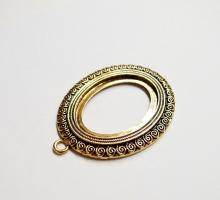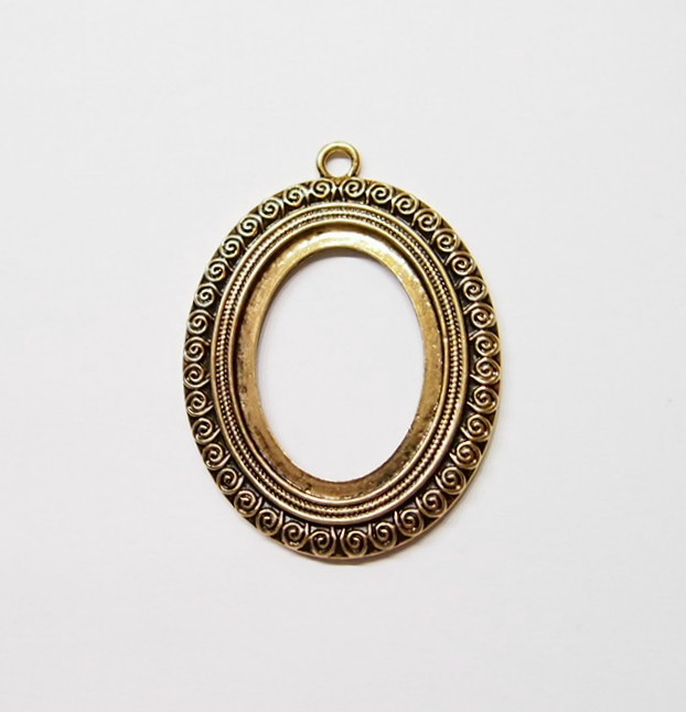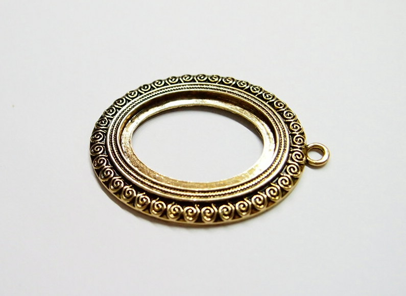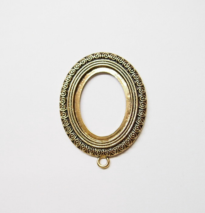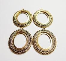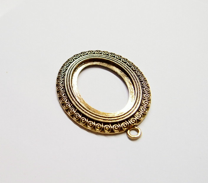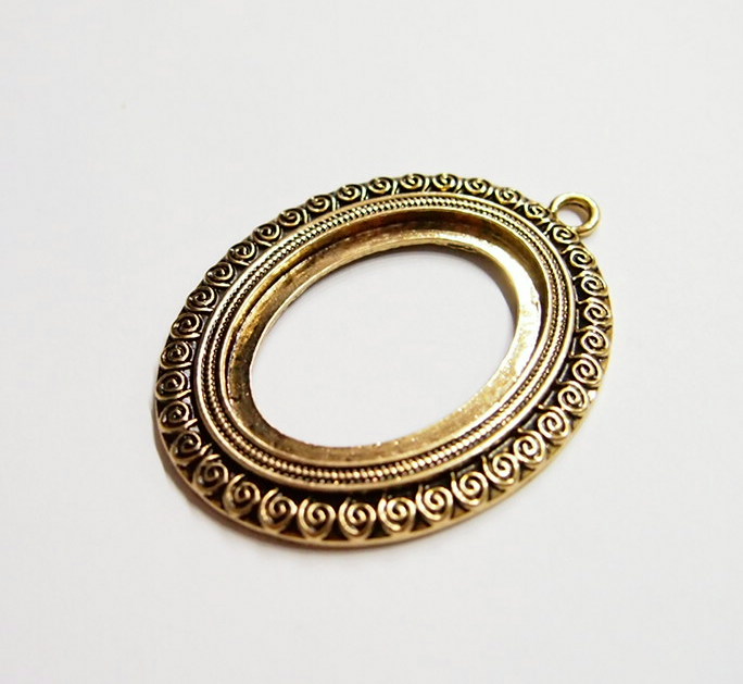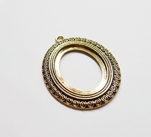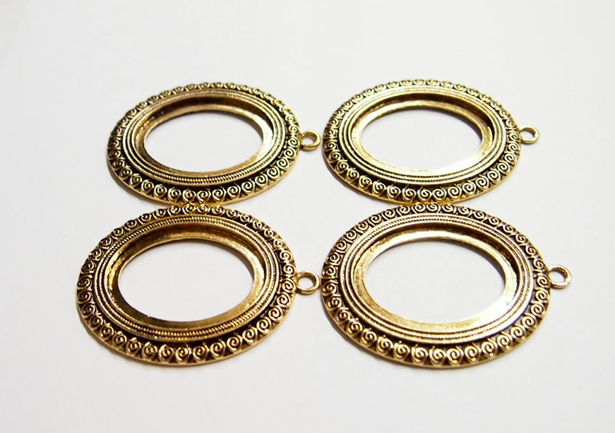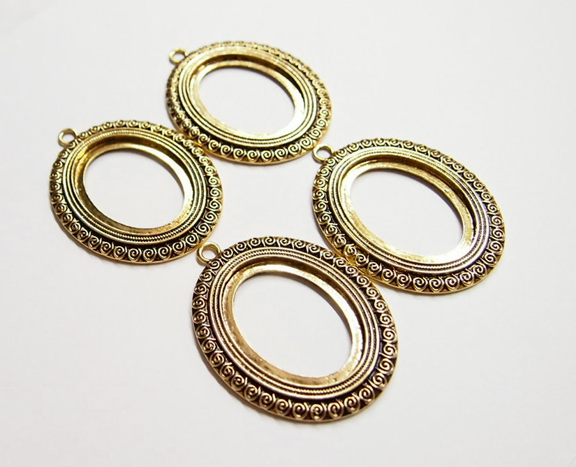You are buying 4 of 40 mm x 30 mm Antique Gold Plated Scroll Pattern Pendant Settings. These settings have a very intricate Scroll Pattern all around the edge. They have the look of the old style Art Deco era Pattern. These settings are originally from the 1900-1930's, I only had a few left and found a company to make these for me and they are gorgeous. These measure 65 mm in length including the loop x 43 mm wide. The top has a nice size loop(4 mm) for your Chain or Cord or Jump Ring (which I have 3 Colors & 2 Sizes of). The design is just delicate, but they are very solid, not flimsy like some are. You will not be disappointed in the quality, it is excellent and if I was setting any cameos or cabs, I would use these. These will work great for any cameos or cabs, they will have to be glued in. I have lots of Great Bails, Bracelets, Cameos, Chains, Connectors, Jump Rings, Lockets, Pendants, Pins, Rings & Settings so, just look at all my listings. I also have these in Antique Silver item #361345026627.