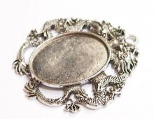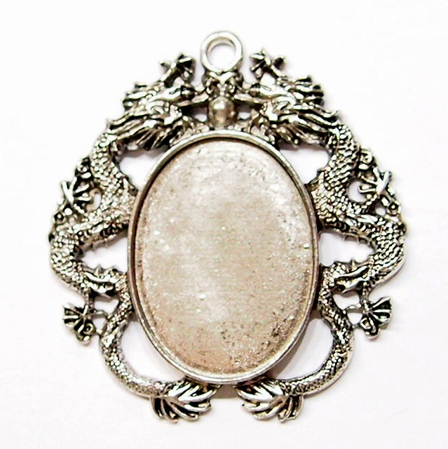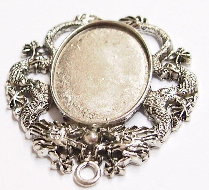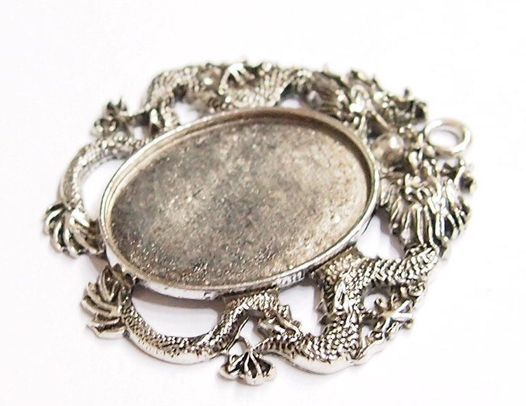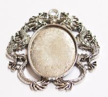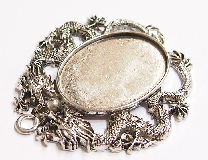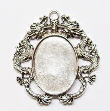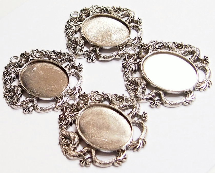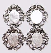 You are buying 4 of 40 mm x 30 mm Antique Silver Plated Decorative Dragon Pendant Settings. These have a very detailed, with a Intricate Dragon one on each side & the entire Dragon, from head to tail, all around these Gorgeous Settings. The outer dimensions are 68 mm x 62 mm including the loop at the top. The top has a nice size loop (4.5 mm) for your Chain or Cord or Jump Ring (which I have 3 Colors & 2 Sizes of). You will not be disappointed in the quality, it is excellent and if I was setting any cameos or cabochons, or glass, or whatever you want, I would use these. These are exactly made for 40 mm x 30 mm. Since they are a solid back, you could go down in size a little if you had an odd size cameo or cab to try & fit. I have lots of Great Bails, Bracelets, Cameos, Chains, Connectors, Jump Rings, Lockets, Pendants, Pins, Rings & Settings so, just look at all my listings. I also have these in antique gold as shown in the next to last picture item #111232660471, sold separately. These are also offered in a group of 12 different Antique Silver 40x30 mm settings item #361475160163, as shown in the last picture, sold separately.