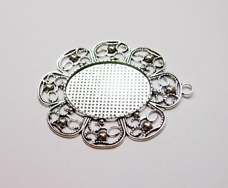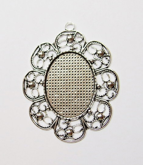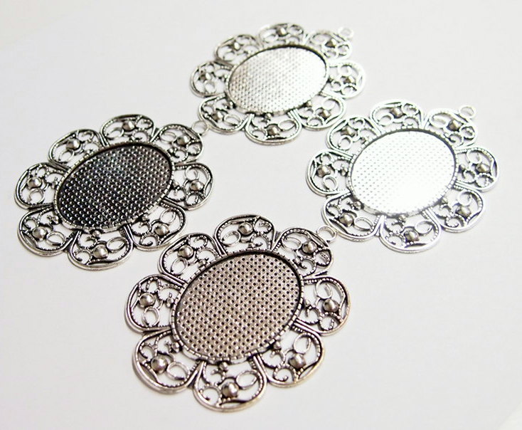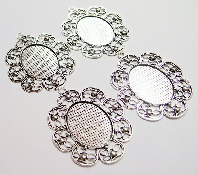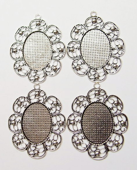 You are buying 4 of 40 mm x 30 mm Antique Silver Plated Flowered Pendant Settings. These settings are originally from the 1900-1930's, I only had a few left and found a company to make these for me and they are gorgeous. The design is just delicate, but they are very solid, not flimsy like the new ones are. These measure 75 x 60 mm including the loop (5 mm) at the top. You will not be disappointed in the quality, it is excellent and if I was setting any cameos or cabochons, I would use these. Since they are a solid back, you could go down in size a little if you had an odd size cameo or cab to try & fit. These will work great for any cameos or cabs, they will have to be glued in. I have lots of Great Bails, Bracelets, Cameos, Chains, Connectors, Jump Rings, Lockets, Pendants, Pins, Rings & Settings so, just look at all my listings.