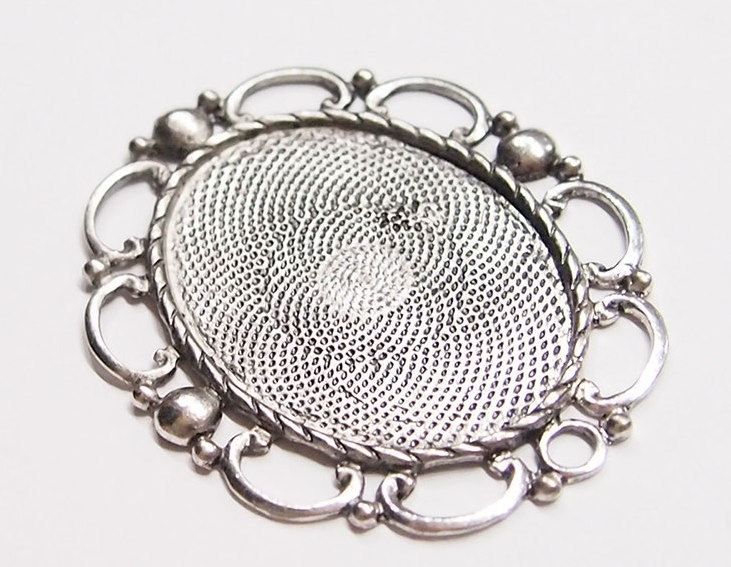You are buying 4 of 40 mm x 30 mm Antique Silver Plated Victorian Art Deco Oval Loop Pendant Settings. They have a nice Victorian loop shape all around the setting and the top has a nice size loop (3.7 mm) for your Chain or Cord or Jump Ring (which I have 3 Colors & 2 Sizes of). The back side is really nice with a star burst pattern on it, you could glue another cameo or cab on the backside and have a double sided pendant. Since they are a solid back, you could go down in size a little if you had an odd size cameo, cabochon, glass, or whatever you want to try & fit. These have never been used, very nice looking and solidly made. I have lots of Great Bails, Bracelets, Cameos, Chains, Connectors, Jump Rings, Lockets, Pendants, Pins, Rings & Settings so, just look at all my listings. I have these in 3 other Colors & in a group of 4 Colors as shown in the next to last picture item #110911242485, sold separately. These are also offered in a group of 10 different Antique Silver 40x30 mm settings item #360944312815 as shown in the last picture, sold separately.