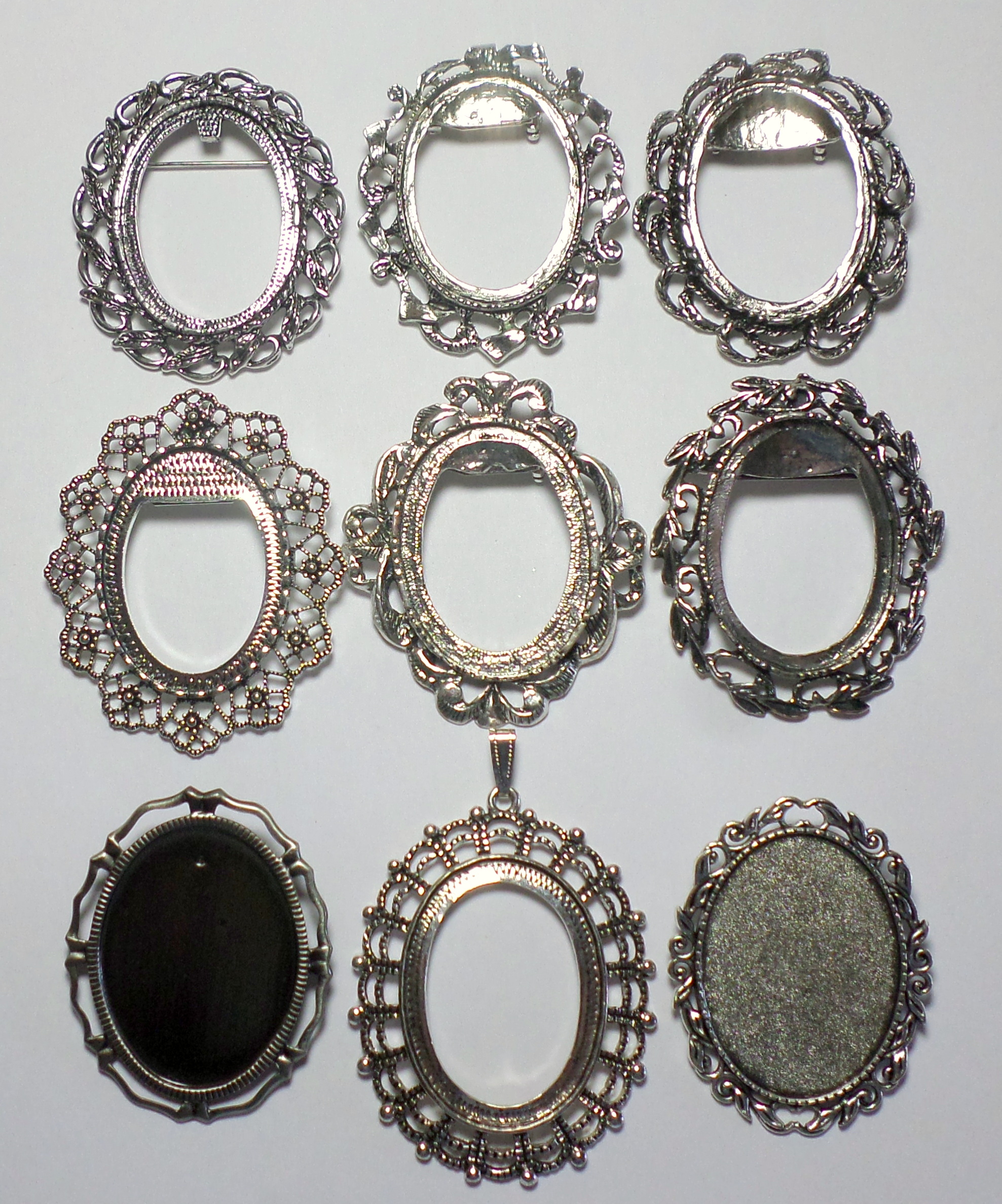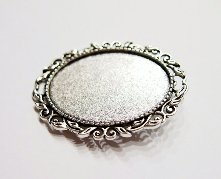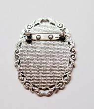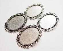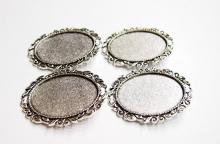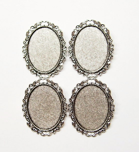 You are buying 4 of 40 mm x 30 mm Antique Silver Plated Intertwined Wreath Pin or Pendant Settings. These settings are originally from the 1900-1930's, I only had a few left and found a company to make these for me and they are beautiful. These have a gorgeous intertwined wreath pattern all around the edges of the setting. These have a place at the top you could put your chain or cord through & wear them as a pendant also. The design is just delicate, but they are very solid, not flimsy like the new ones are. These are lightweight but sturdy. Since they are a solid back, you could go down in size a little if you had an odd size cameo or cab to try & fit. You will not be disappointed in the quality, it is excellent and if I was setting any cameos or cabs, I would use these. These will work great for any cameos or cabs, they will have to be glued in. I have lots of Great Bails, Bracelets, Cameos, Chains, Connectors, Jump Rings, Lockets, Pendants, Pins, Rings & Settings so, just look at all my listings. I also have these in Antique Gold item #111722076415. These are also offered in a group of 9 different Antique Silver 40x30 mm settings item # 112451166587 as shown in the last picture.