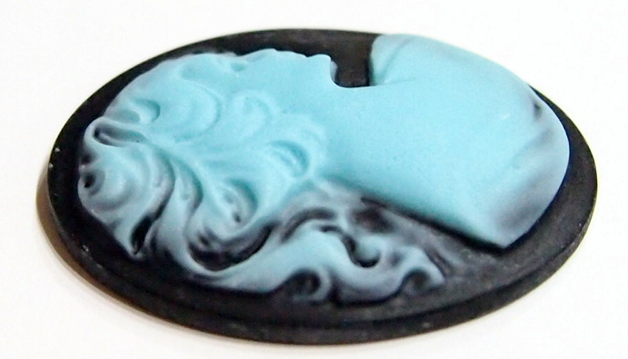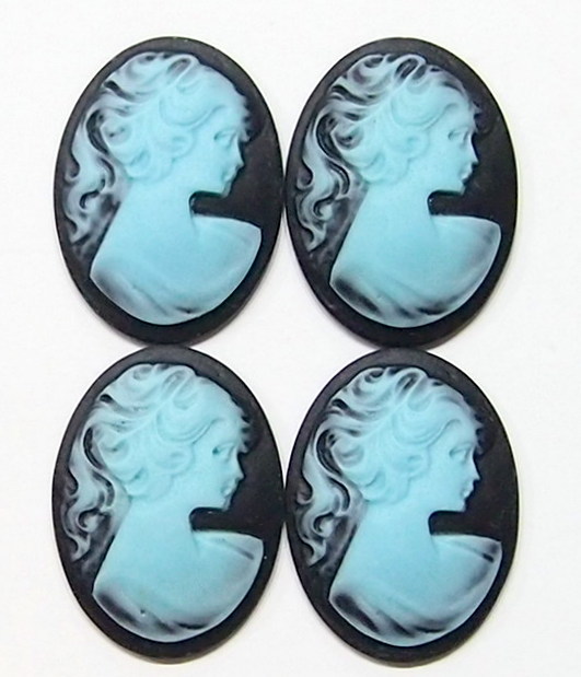 You are buying 4 of 40 mm x 30 mm Aqua Blue over Black Classic Ponytail Woman Cameos. They are of a Beautiful Victorian Woman with a ponytail facing right, these are molded. The images stand out from the cameo to give you the 3-d effect. They are a Aqua Blue color to a Black background. They measure 40 mm x 30 mm. They look very detailed for their size. I have lots of Great Bails, Bracelets, Cameos, Chains, Connectors, Jump Rings, Lockets, Pendants, Pins, Rings & Settings so, just look at all my listings. These are also offered in a group of 10 Colors as shown in the last picture item #360600704578. I offer lots of other Cameos like this and in groups so give them all a look.