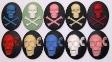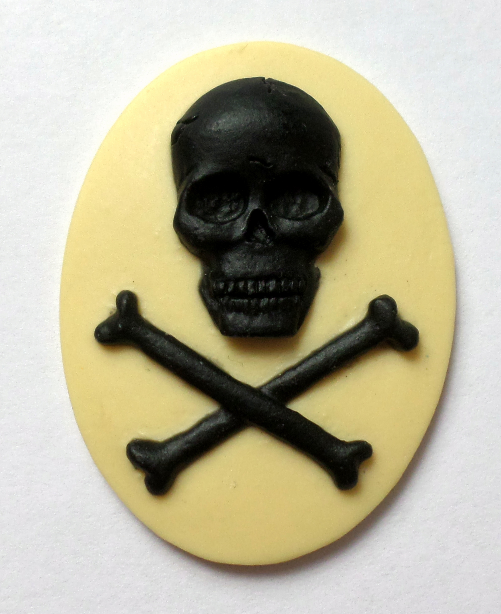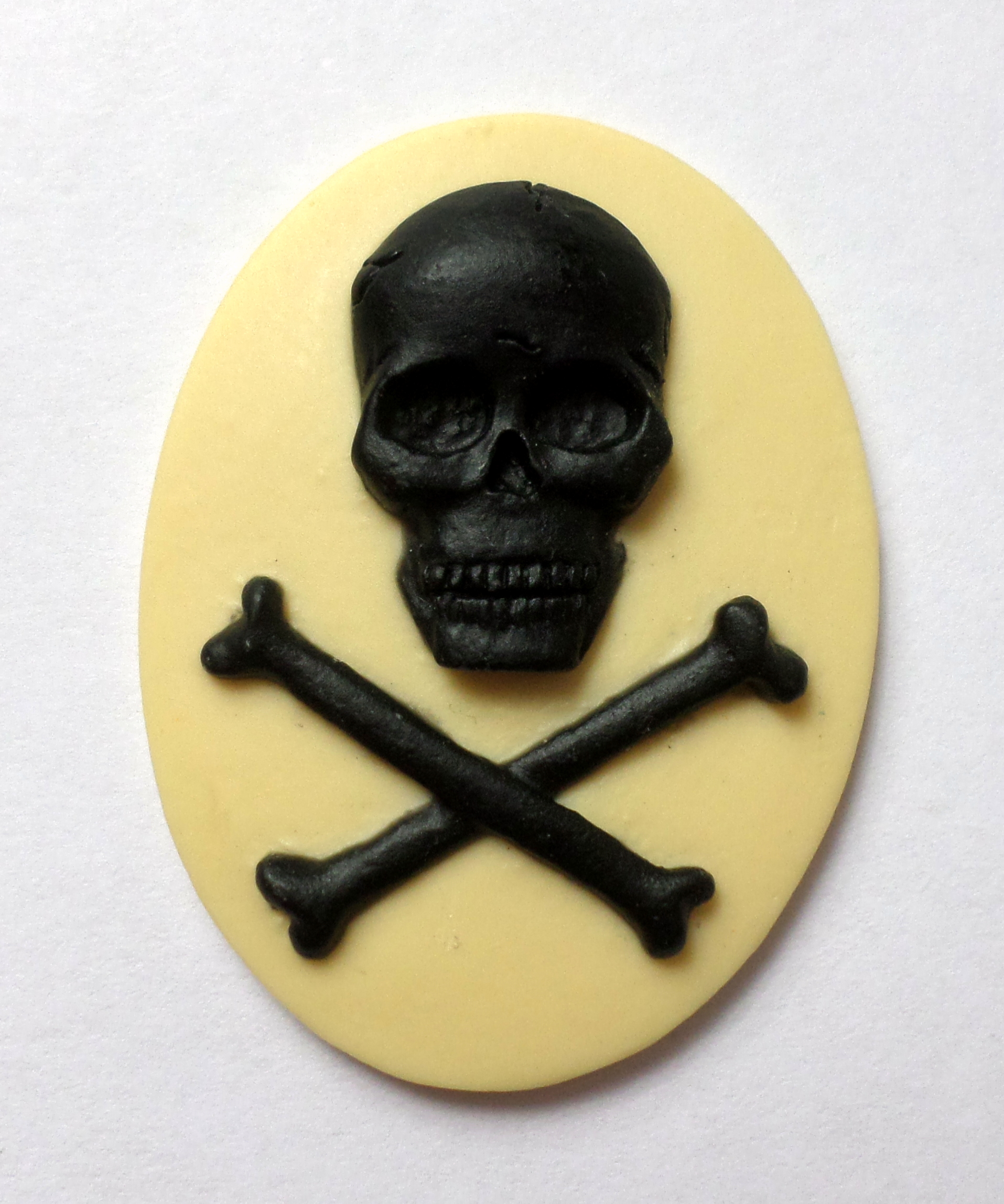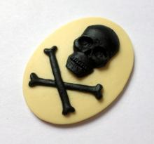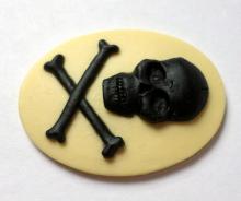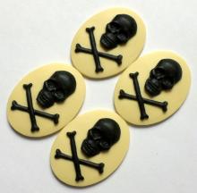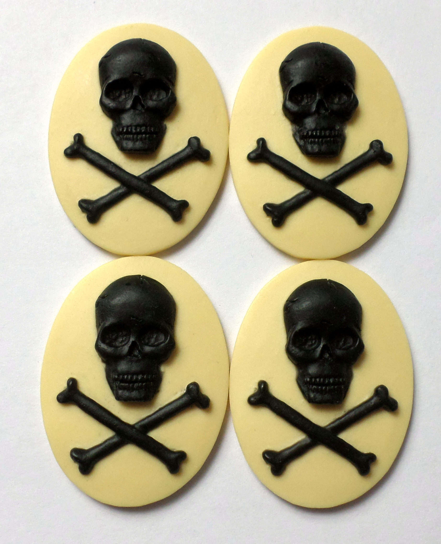 You are buying 4 of 40 mm x 30 mm Black over Cream Skull & Cross Bones Cameos. They are of the Gothic Skull and Cross Bones Pirates beware, the molding is very well done. They are a COOL Black over Cream Background. They measure 40 mm x 30 mm. I have them in all sorts of colors, so check my other listings. These look very detailed for their size, in fact, they stand out from the background to give it a 3-D look. They have never been used. I have lots of Great Bails, Bracelets, Cameos, Chains, Connectors, Jump Rings, Lockets, Pendants, Pins, Rings & Settings so, just look at all my listings. These are also offered in a group of 10 different skull and crossbones and pirate cameos as shown in the last picture item #360747497265, sold separately. I also have several Colors in this theme in 25x18 mm Cameos.