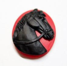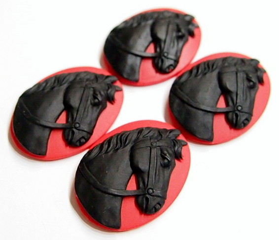 You are buying 4 of 40 mm x 30 mm Black over Red Horse Head Portrait Cameos. They are of a portrait of a horse's head, very cute, these are molded. The images stand out from the cameo to give them the 3-d effect. They are a Black color with a Red background. They measure 40 mm x 30 mm. They look very detailed for their size. I have lots of Great Bails, Bracelets, Cameos, Chains, Connectors, Jump Rings, Lockets, Pendants, Pins, Rings & Settings so, just look at all my listings. I have these in 3 other colors and are included in a group of 8 different colors of 40x30 mm horse cameos item # 360471676540 as shown in the next to last picture, sold separately. I also have a group of Horses in 6 different colors of 25x18 mm as shown in the last picture item #360471679672 sold separately.