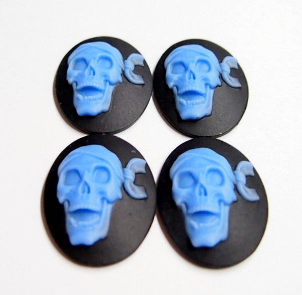 You are buying 4 of 40 mm x 30 mm Blue over Black Skull Head with Bandana Cameos. They are of a Skull with Bandana on, Pirates beware, the molding is very well done. They are a Blue on a Black Background. Really a nice color combination. They measure 40 mm x 30 mm. I have them in all sorts of colors and sizes, so check my other listings. They look very detailed for their size, in fact, they stand out from the background to give it a 3-D look. They have never been used. I have them in all sorts of colors, so check my other listings. These look very detailed for their size, in fact, they stand out from the background to give it a 3-D look. They have never been used. I have lots of Great Bails, Bracelets, Cameos, Chains, Connectors, Jump Rings, Lockets, Pendants, Pins, Rings & Settings so, just look at all my listings. These are also offered in a group of 10 different skull and crossbones and pirate cameos as shown in the last picture item #360747497265, sold separately. I also have several Colors in this theme in 25x18 mm Cameos.