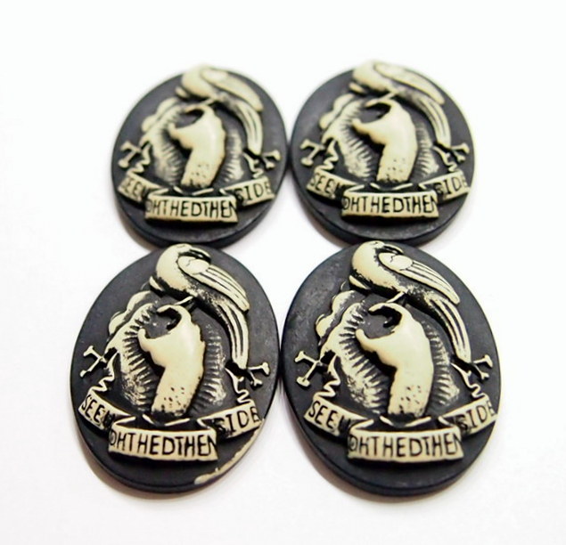 You are buying 4 of 40 mm x 30 mm Bone Color over Black See You On the Other Side Cameos. These are of a Ribbon Banner reading See You On the Other Side. A Hand is reaching for the Bird of Paradise & there are scattered Bones in the background. These are really nice & the details are great. These are Bone Color over a black background. I have lots of Great Bails, Bracelets, Cameos, Chains, Connectors, Jump Rings, Lockets, Pendants, Pins, Rings & Settings so, just look at all my listings. These are also offered in a group of 8 Different Cameos as shown in the last picture item #111183410789. I have lots of Zombies (even Female) in Several Colors & sizes.