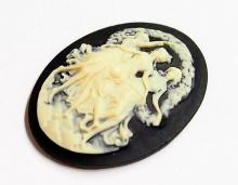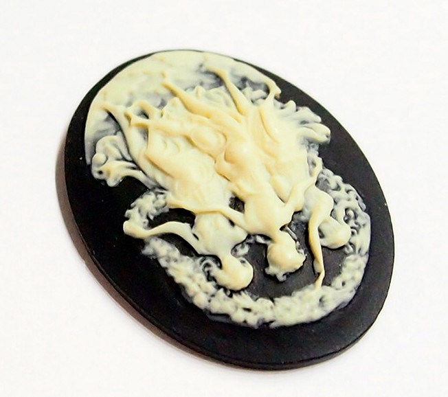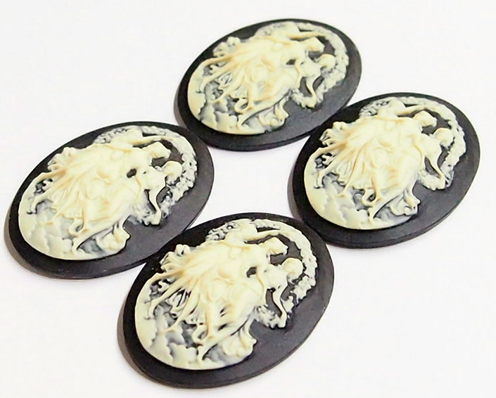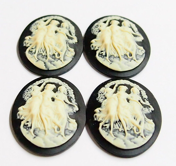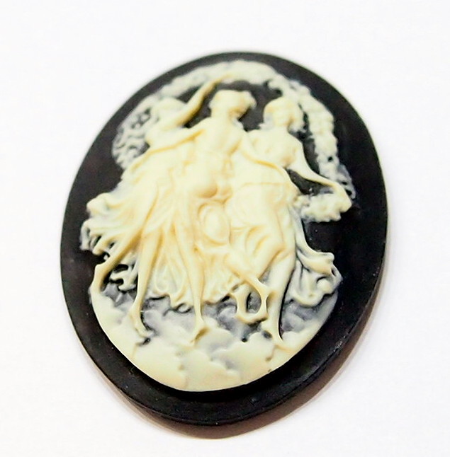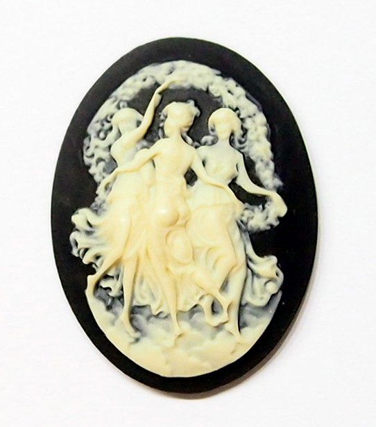 You are buying 4 of 40 mm x 30 mm Cream over Black Classic Three Graces or Muses Cameos. These are so gorgeous, this shows a beautiful Mythology 3 Graces or Muses dancing. The three Muses are Cream on a Black background. These measure 40 x 30 mm. The Greek goddesses Euphrosyne, Aglaia, and Thalia, representative of gentleness and refinement. The molding process of these are just great, no flaws. I have several different settings these will fit in. They look very detailed for their size. I have lots of Great Bails, Bracelets, Cameos, Chains, Connectors, Jump Rings, Lockets, Pendants, Pins, Rings & Settings so, just look at all my listings. These are included in a group of 6 different colors of 40x30 mm Grecian 3 muses or graces dancing cameos item #111915619606 as shown in the third from last picture. Also offered is a group of 5 different colors of 40x30 mm Grecian/Muse with Floral Cameos as shown in the second from last picture item #111094871611. The last picture is another group of 6 different colors of 40x30 mm Women with a bird cameos item #110911248601.