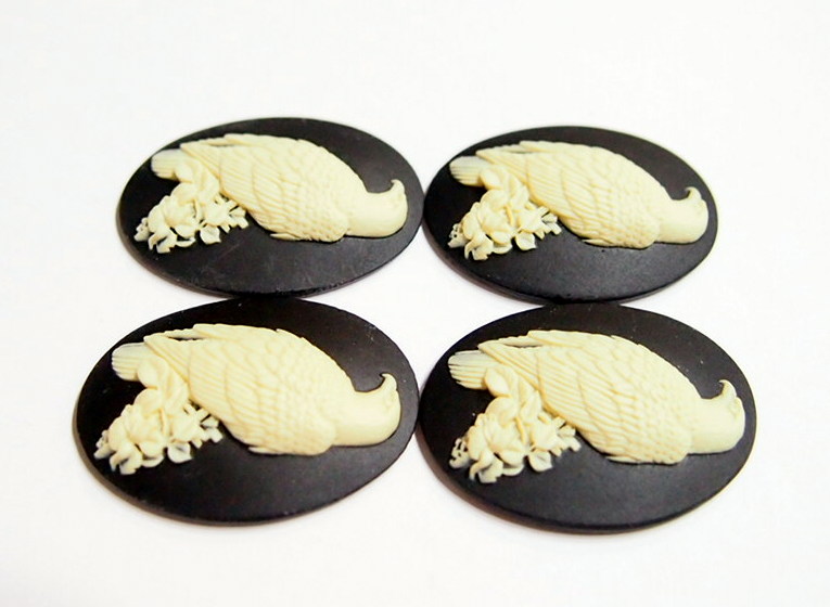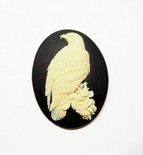 You are buying 4 of 40 mm x 30 mm Cream over Black American Eagle Cameos. They are of a Gorgeous American Bald Eagle perched on top of a tree with leaves. The images stand out from the cameo to give you the 3-d effect. These are a Cream color on a Black background. They measure 40 mm x 30 mm. These look very detailed for their size. I have lots of Great Bails, Bracelets, Cameos, Chains, Connectors, Jump Rings, Lockets, Pendants, Pins, Rings & Settings so, just look at all my listings. I also have these in a group of 10 different cameos as shown in the last picture item #360471676540. I also have several other Animal Cameos (Dogs, Cats, Birds, Dolphins, Horses, Bears, Rabbits, & Butterflies) in several sizes.