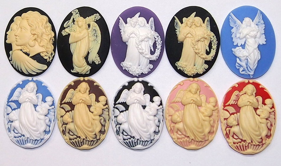 You are buying 4 of 40 mm x 30 mm Cream over Black Cross Carrying Woman Angel Cameos. They are of a Beautiful Full Body Style Female Angel carrying a cross on her shoulder. She stands out from the cameo to give it the 3-d effect. They are cream in color, the background is black. They measure 40 mm x 30 mm. They look very detailed for their size. I have lots of Great Bails, Bracelets, Cameos, Chains, Connectors, Jump Rings, Lockets, Pendants, Pins, Rings & Settings so, just look at all my listings. These are also offered in a group of 4 of the same color angel themed 40x30 mm cameos as shown in the next to last picture item #112509632709, sold separately. These are also included in a group of 10 different Colors and themes of 40x30 mm angel resin cameos as shown in the last picture item #360601358717, sold separately.