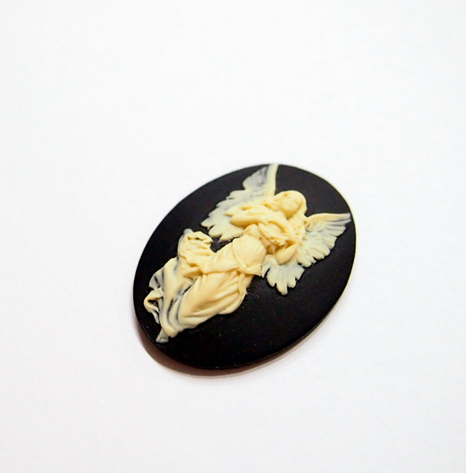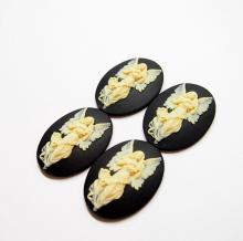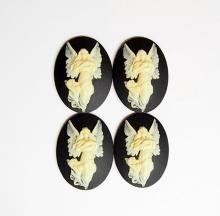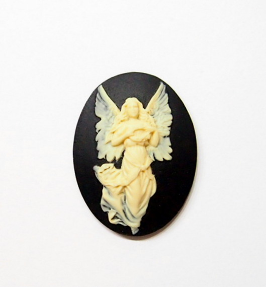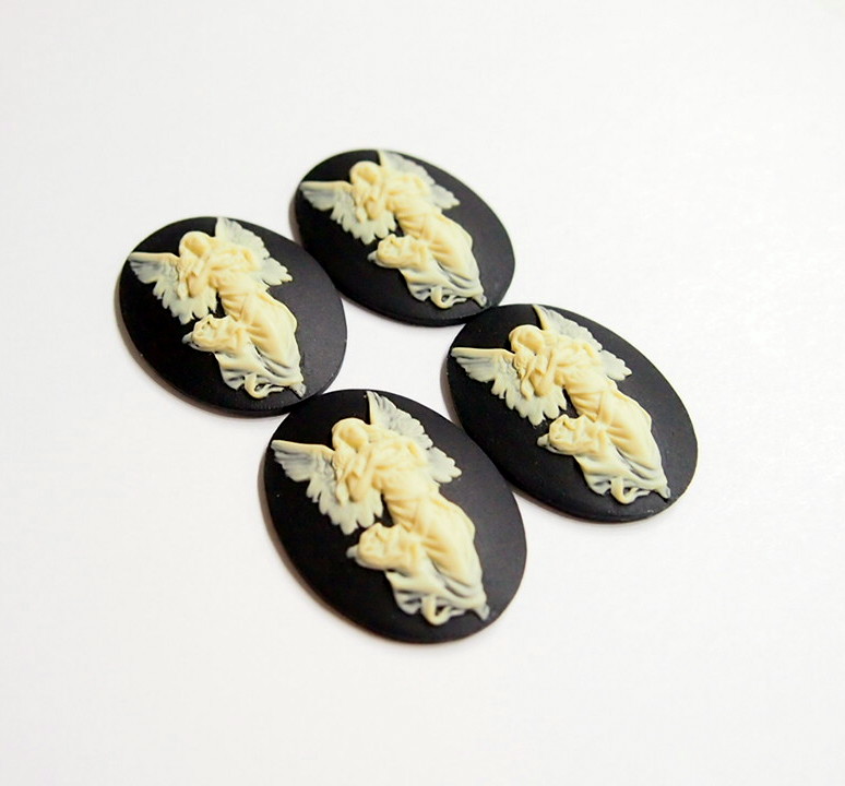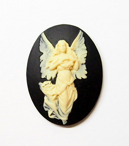 You are buying 4 of 40 mm x 30 mm Cream over Black Flying Angel Cameos. They are of a Beautiful Standing or flying Full body Angel, she is just gorgeous, these are molded. The details are very sharp and stand away from the background, giving them a 3-D effect. They are a Cream color over a Black color background. They measure 40x30 mm. They look very detailed for their size. I have lots of Great Bails, Bracelets, Cameos, Chains, Connectors, Jump Rings, Lockets, Pendants, Pins, Rings & Settings so, just look at all my listings. I have these in 1 other Color (White over Baby Blue) item #111759121149 and I offer a group of 10 Colors of Angels item #360601358717 as shown in the next to last picture, sold separately. I also have a Glass 40x30 Angel that is amazing item #111563956363 as shown in the last picture, sold separately. I have lots of other Cameos with this theme in several Colors & sizes & in groups so give them all a look.