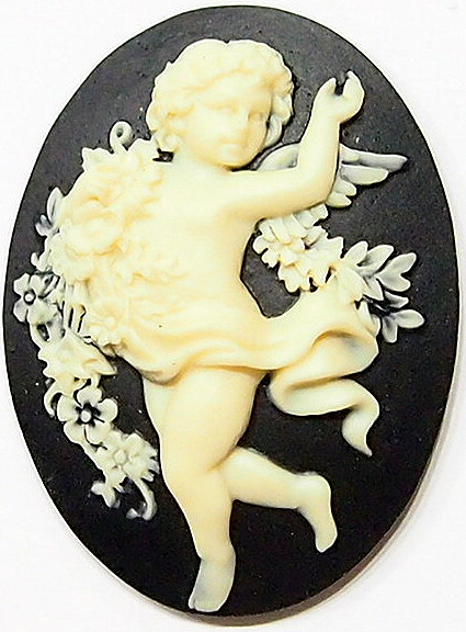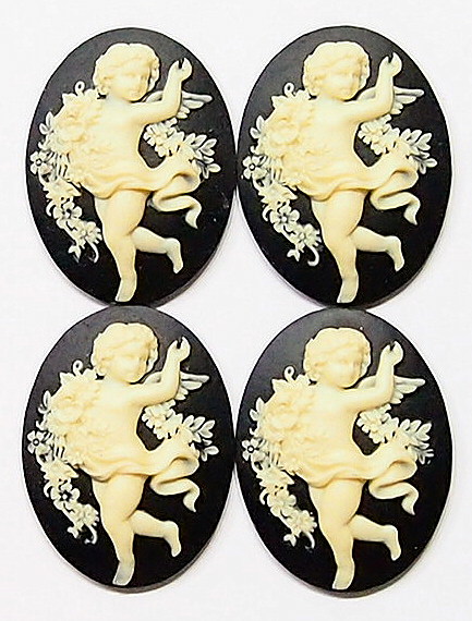 You are buying 4 of 40 mm x 30 mm Cream over Black Happy Full Length Floral Cherub Cameos. They are of a Beautiful Full Body Style Cherub with a floral design all around. The cherub stands out from the cameo to give it the 3-d effect. They are cream in color, the background is Black, running with a floral wreath. They measure 40 mm x 30 mm. These look very detailed for their size. I have lots of Great Bails, Bracelets, Cameos, Chains, Connectors, Jump Rings, Lockets, Pendants, Pins, Rings & Settings so, just look at all my listings.