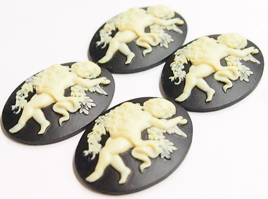 4 of 40x30 mm Cream over Black Happy Full Length Floral Cherub Cameos, Very Nice