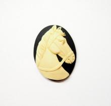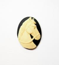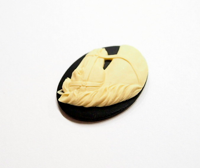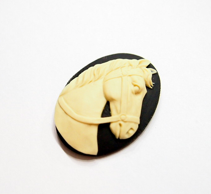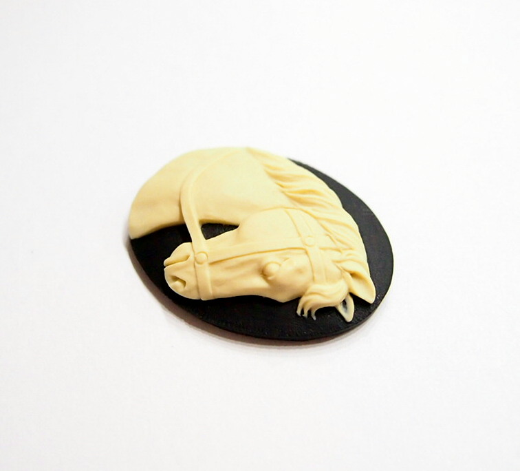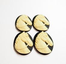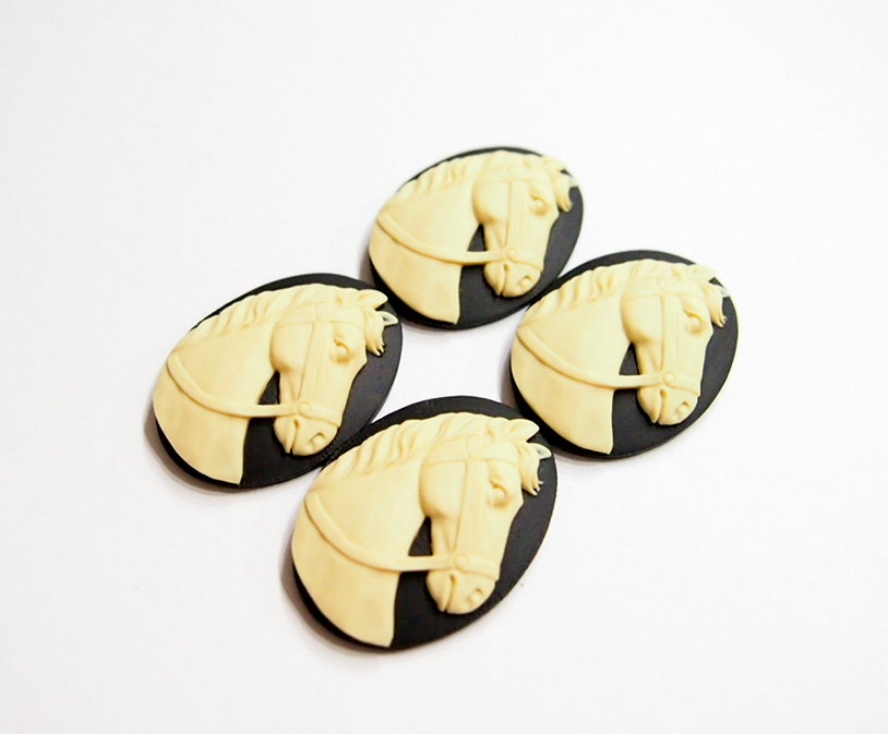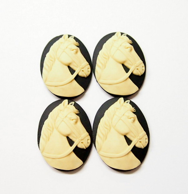 You are buying 4 of 40 mm x 30 mm Cream over Black Horse Head Portrait Cameos. These are a portrait of a horse's head, and are molded resin. The details are very sharp and stand away from the background, giving it a 3-D effect. These are a Cream Color over a Black background. They measure 40 mm x 30 mm. They look very detailed for their size. I have lots of Great Bails, Bracelets, Cameos, Chains, Connectors, Jump Rings, Lockets, Pendants, Pins, Rings & Settings so, just look at all my listings. I have these in 3 other colors and are included in a group of 8 different colors of 40x30 mm horse cameos item #360471676540 as shown in the last picture, sold separately.