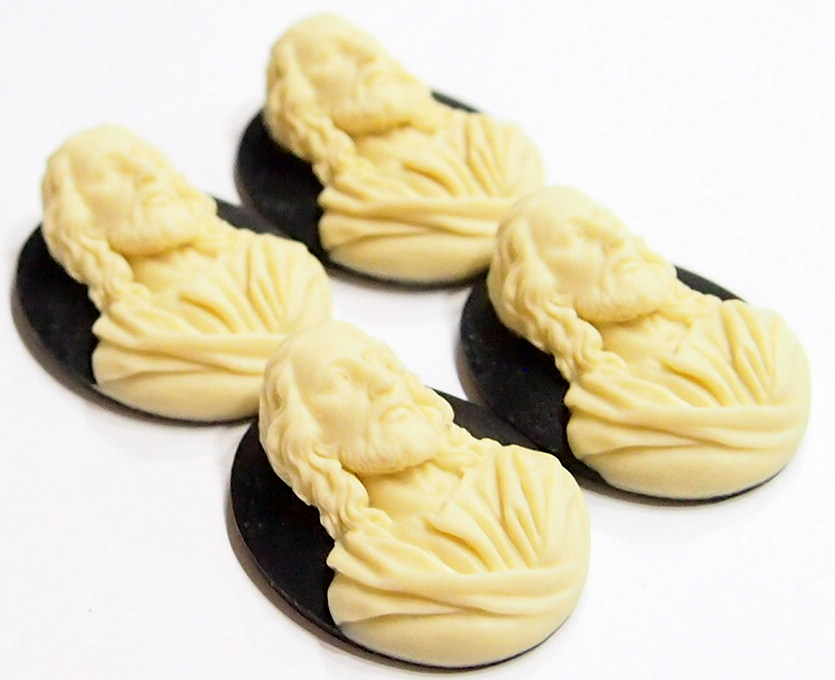 You are buying 4 of 40 mm x 30 mm Cream over Black Jesus Cameos. They are of Jesus, the molding is very well done. They are a gorgeous Cream on a Black background. They measure 40 mm x 30 mm. They look very detailed for their size, in fact, they stand way out from the background to give them a 3-D look. I have lots of Great Bails, Bracelets, Cameos, Chains, Connectors, Jump Rings, Lockets, Pendants, Pins, Rings & Settings so, just look at all my listings. I also have lots of Virgin Mary in several poses & Colors Cameos.