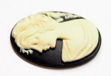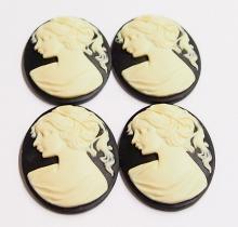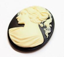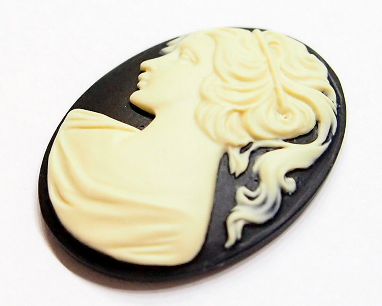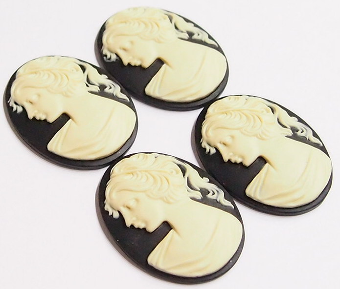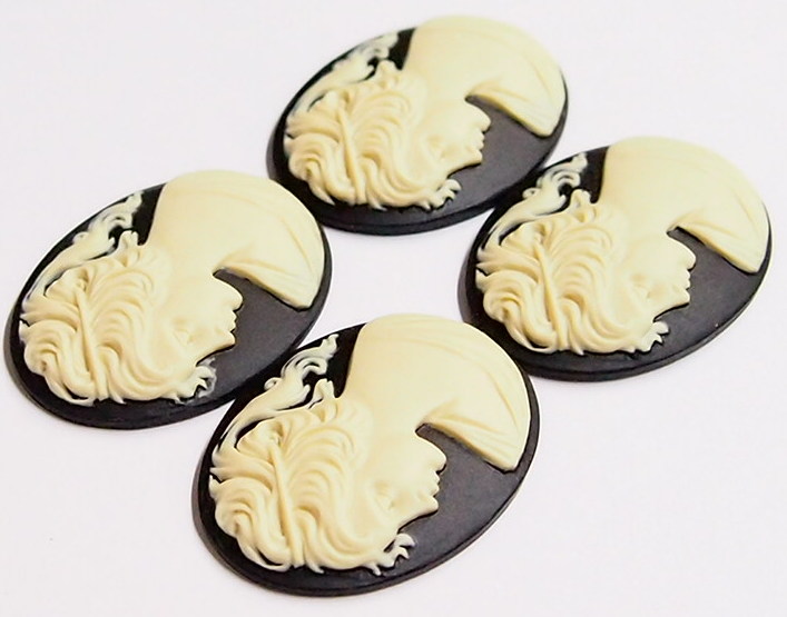 You are buying 4 of 40 mm x 30 mm Cream over Black Left Facing Ponytail Woman Cameos. They are of a Beautiful Victorian Woman with a ponytail facing Left, these are molded. The images stand out from the cameo to give you the 3-d effect. They are a gorgeous Cream color to a Black background. They measure 40 mm x 30 mm and they look very detailed for their size. I have lots of Great Bails, Bracelets, Cameos, Chains, Connectors, Jump Rings, Lockets, Pendants, Pins, Rings & Settings so, just look at all my listings. These are also offered in a group of 10 different Colors of 40x30 mm Cameos as shown in the last picture item #360600704578. I offer lots of other Cameos like this and in groups so give them all a look.