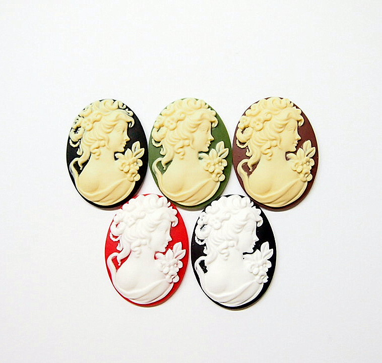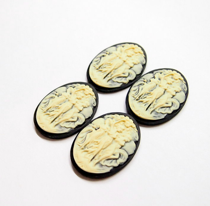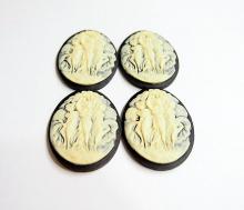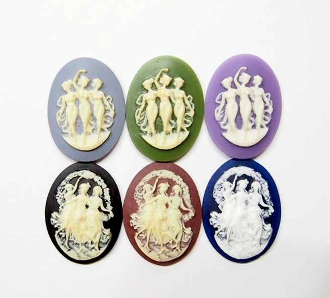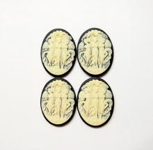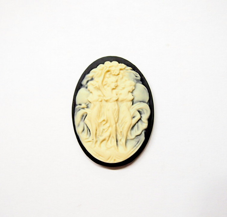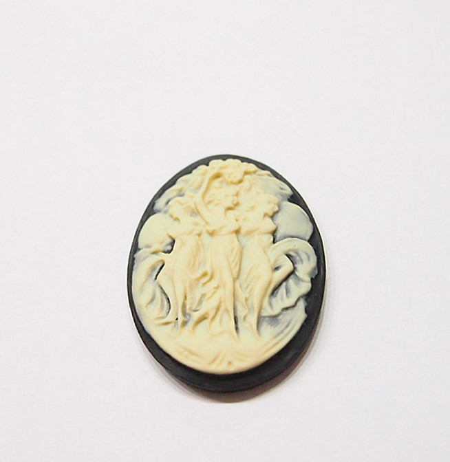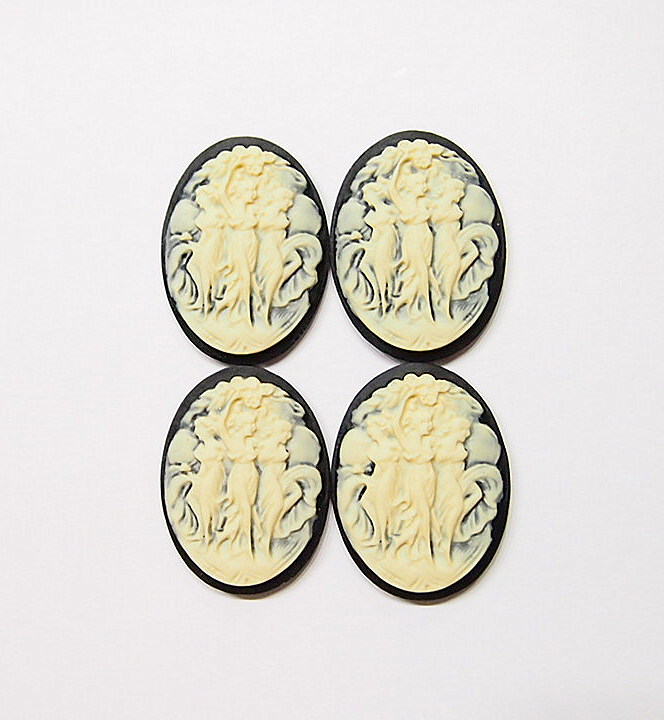 You are buying 4 of 40 mm x 30 mm Cream over Black Old Style Three Muses or Graces Women Dancing Cameos. These are so beautiful, these all show 3 Muses or Graces dancing or posing. The details are very sharp and stand away from the background, giving them a 3-D effect. Three Graces: The Greek goddesses Euphrosyne, Aglaia, and Thalia, representative of gentleness and refinement. The molding process of these are just great, no flaws. I have several different settings these will fit in. These are very detailed and all my cameos have never been used. These are pretty fabulous. These measure 40 mm x 30 mm. I have lots of Great Bails, Bracelets, Cameos, Chains, Connectors, Jump Rings, Lockets, Pendants, Pins, Rings & Settings so, just look at all my listings. I also offer a group of 6 Colors in 40x30 mm Grecian Muses with Floral Cameos as shown in the third from last picture item #111915619606, sold separately. I also have a group 10 Grecian Women in 25x18 mm item #360935670102 as shown in the next to last picture, sold separately. Also offered is a group of 5 Colors in 40x30 mm Grecian Muses with Floral Cameos as shown in the last picture item #111094871611, sold separately.