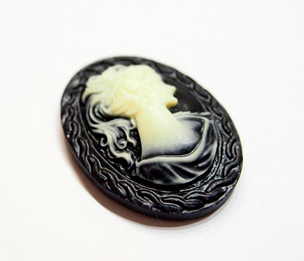 You are buying 4 of 40 mm x 30 mm Cream over Black Ponytail Lady with Lace Edges Cameos. These are so gorgeous, this shows a beautiful Victorian Woman with a ponytail & the edges have a lacy pattern all around the outside. The Victorian Lady is Cream on a Black background. The molding process of these are just great, no flaws. I have several different settings these will fit in. These are pretty fabulous. They measure 40 mm x 30 mm. They look very detailed for their size. I have lots of Great Bails, Bracelets, Cameos, Chains, Connectors, Pendants, Pins, Rings & Settings so, just look at all my listings. I have these in 3 other Colors & in a group of 4 Colors.