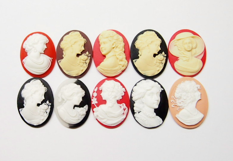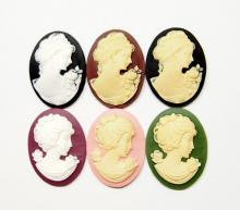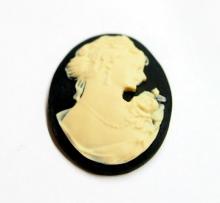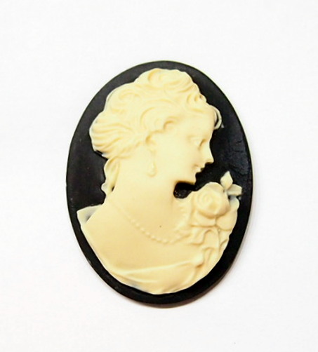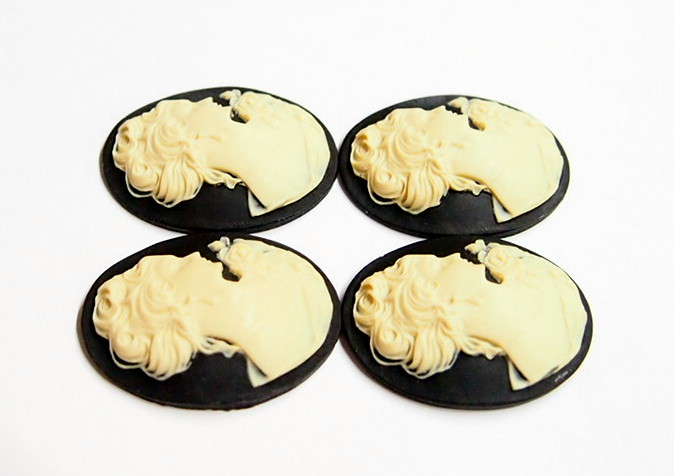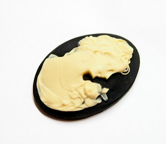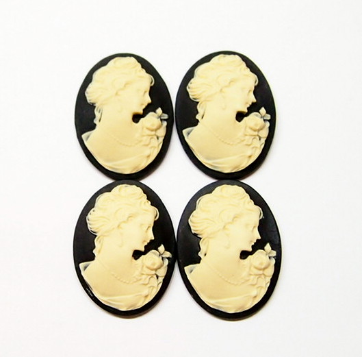 You are buying 4 of 40 mm x 30 mm Cream over Black Rose Corsage Woman Cameos. They are of a Beautiful Victorian woman with a pearl necklace and Rose Corsage on the side of her dress. The details are very sharp and stand away from the background, giving it a 3-D effect. They are cream in color, & the background is Black. They measure 40x30 mm. These are pretty fabulous. I have lots of Great Bails, Bracelets, Cameos, Chains, Connectors, Jump Rings, Lockets, Pendants, Pins, Rings & Settings so, just look at all my listings. I have these in 2 other Colors, Cream over Brown and White over black. These are also offered in a group of 6 corsage and shy women 40x30 mm cameos item #2914060384321, as shown in the next to last picture, sold separately. Also offered in a group of 10 different women 40x30 mm cameos as shown in the last picture item #360600699936, sold separately.