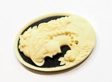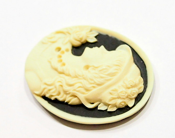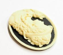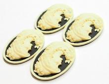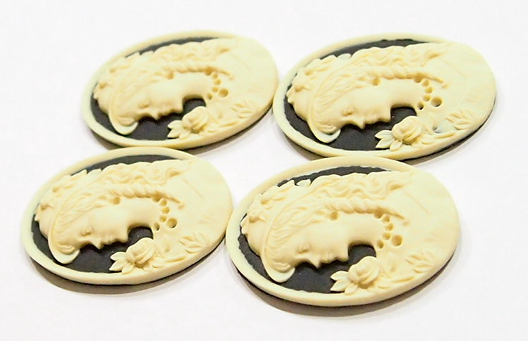 You are buying 4 of 40 mm x 30 mm Cream over Black Left Facing Victorian Woman with Hat Cameos. They are of a Victorian woman with a fabulous hat on with her hair draping down and her necklace & earring can be fitted with small seed beads or rhinestone or leave it just the way it is as it looks just fine. The molding is very well done. They are a Creamy Color on a black background with a cream color rim. They look very detailed for their size, in fact, she stands out from the background to give it a 3-D look. I have lots of Great Bails, Bracelets, Cameos, Chains, Connectors, Jump Rings, Lockets, Pendants, Pins, Rings & Settings so, just look at all my listings. I have several other Cameos with Hats.