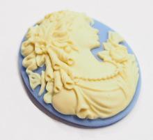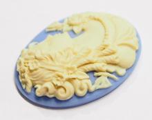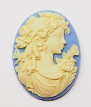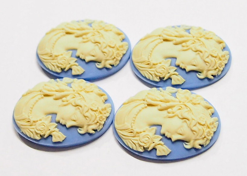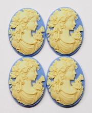You are buying 4 of 40 mm x 30 mm Cream over Blue Grecian Muse with Butterflies Cameos. These are so gorgeous, this shows a beautiful Mythology Muse or Grecian woman in a gown with her hair up and her hairband is all floral with roses and there are two dragonflies or butterflies on either side of her. She is wearing a pearl necklace and her gown has a floral accent too, they are perfect. The molding process of these are just great, no flaws. I have lots of Great Bails, Bracelets, Cameos, Chains, Connectors, Jump Rings, Lockets, Pendants, Pins, Rings & Settings so, just look at all my listings. I have these in 2 other Colors & in a group of 10 Colors as shown in the last picture item #360471677811.
