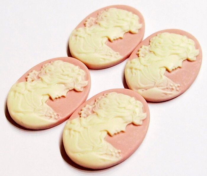 You are buying 4 of 40 mm x 30 mm Cream over Pink Wispy Hair Woman Cameos. These are so gorgeous, this shows a beautiful Victorian Woman, facing right, who is wearing pearls and has a beautiful face. The Victorian Lady is cream on a Pink background. The molding process of these are just great, no flaws. I have several different settings these will fit in. These are pretty fabulous. They actually measure 38 mm x 28.5 mm and fit into a 40 mm x 30 mm Setting just fine you just have to center it just a bit. They look very detailed for their size. I have lots of Great Bails, Bracelets, Cameos, Chains, Connectors, Pendants, Pins, Rings & Settings so, just look at all my listings. I have these in 1 other Color.