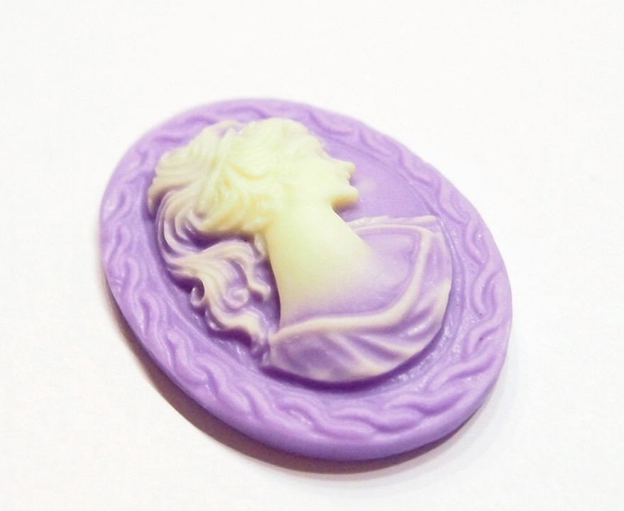 You are buying 4 of 40 mm x 30 mm Cream over Purple Ponytail Lady with Lacy Edge pattern Cameos. These are so gorgeous, this shows a beautiful Victorian Woman with a ponytail. The Victorian Lady is Cream on a Purple background with a lacy edge pattern all around the outside. The molding process of these are just great, no flaws. I have several different settings these will fit in. These are pretty fabulous. They measure 40 mm x 30 mm. They look very detailed for their size. I have lots of Great Bails, Bracelets, Cameos, Chains, Connectors, Pendants, Pins, Rings & Settings so, just look at all my listings. I have these in 5 other Colors & in a group of 8 Colors.