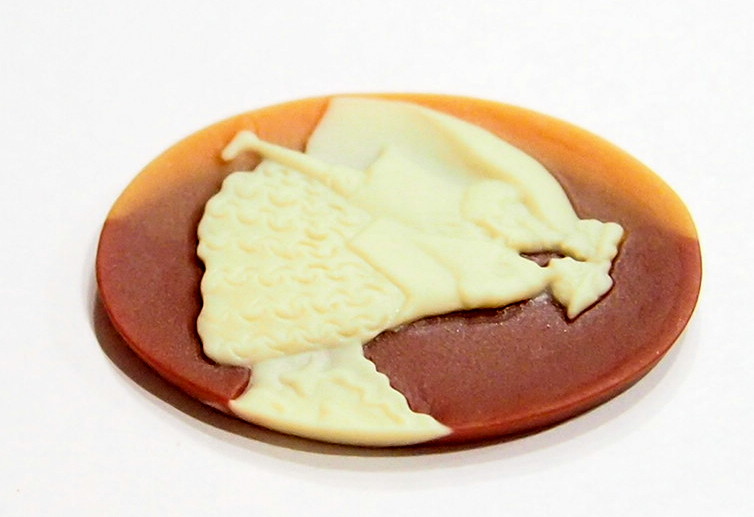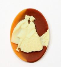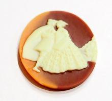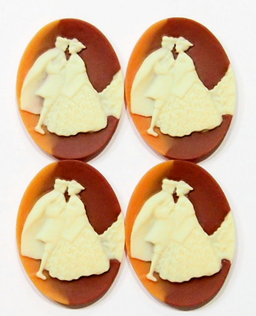 You are buying 4 of 40 mm x 30 mm Cream over Tortoise Color Colonial Man & Woman Embracing or Dancing, these are Vintage Molded Resin Cameos. These are so gorgeous, this shows a Victorian Colonial Man with his dashing cape and a beautiful Woman, both standing face to face in Cream on a background of 2 tone Tortoise colored background. The molding process of these are just great, no flaws. I have several different settings these will fit in. These are pretty fabulous. They measure 40 mm x 30 mm. They look very detailed for their size. I have lots of Great Bails, Bracelets, Cameos, Chains, Connectors, Jump Rings, Lockets, Pendants, Pins, Rings & Settings so, just look at all my listings.