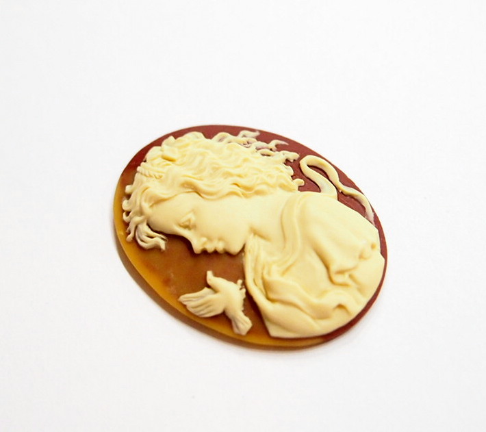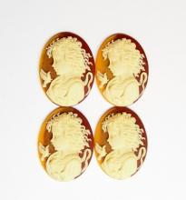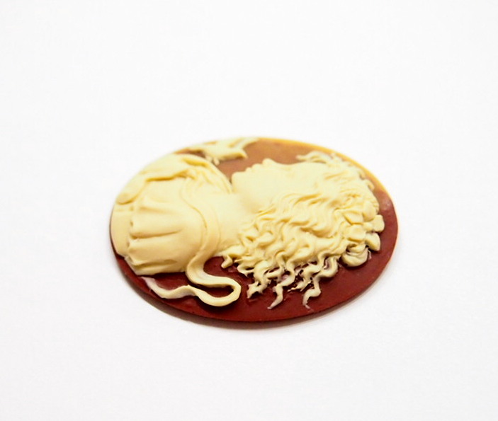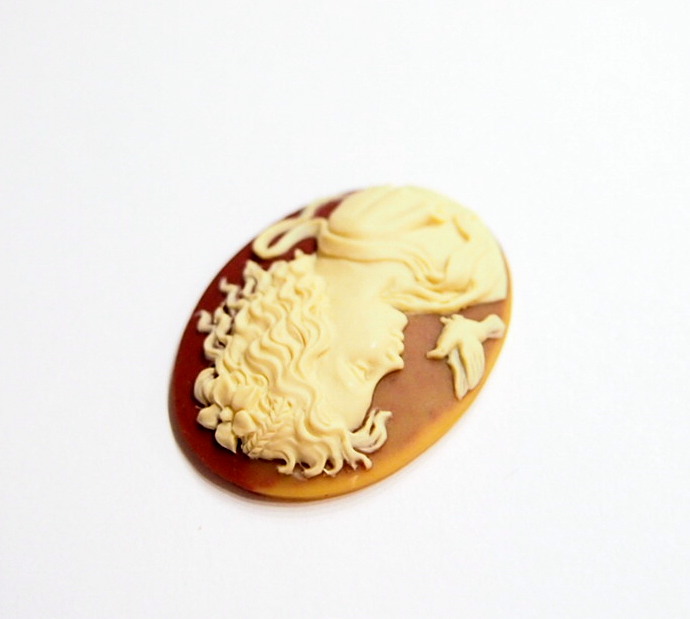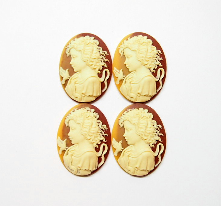 You are buying 4 of 40 mm x 30 mm Cream over Tortoise Young Lady Facing Left Portrait Style with a Bird Molded Resin Cameos. These are so gorgeous, this shows a beautiful Young Lady Head Portrait facing Left in Cream on a background of a Tortoise color. The molding process of these are just great, no flaws. I have several different settings these will fit in. These are pretty fabulous. They measure 40 mm x 30 mm. They look very detailed for their size. I have lots of Great Bails, Bracelets, Cameos, Chains, Connectors, Jump Rings, Lockets, Pendants, Pins, Rings & Settings so, just look at all my listings. I have these in one other Color as shown in the next to last picture item #360471676531 sold separately. I also have a group of 4 different Colors of left facing women as shown in the last picture item #360471675603 also sold separately.