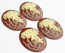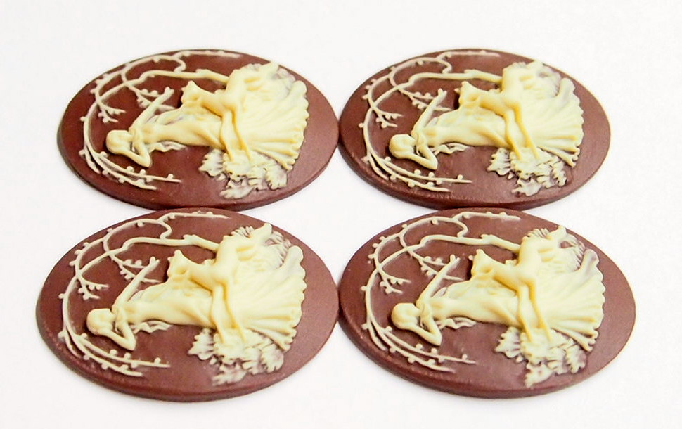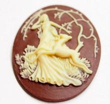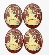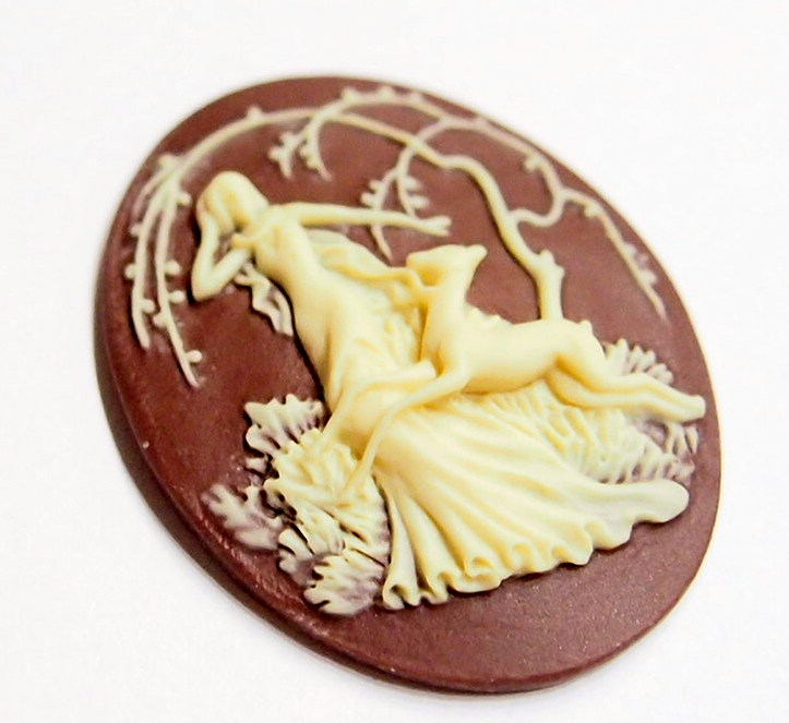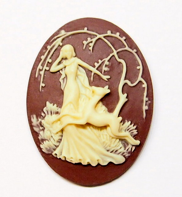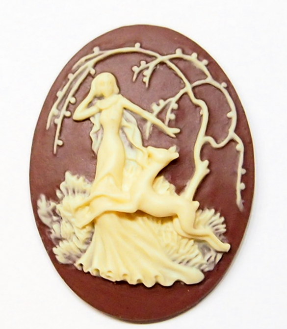 You are buying 4 of 40 mm x 30 mm Cream over Brown Goddess Diana, the Huntress & Deer Cameos. They are of a beautiful Goddess Diana, the Huntress, with a Deer, these are molded. In Roman mythology, Diana was the goddess of the hunt, the moon and birthing, being associated with wild animals and woodland, and having the power to talk to and control animals. The image stands out from the cameo to give you the 3-d effect. They are a Cream over Brown color background. Really a pretty color combination. They measure 40 mm x 30 mm. They look very detailed for their size. I have lots of Great Bails, Bracelets, Cameos, Chains, Connectors, Jump Rings, Lockets, Pendants, Pins, Rings & Settings so, just look at all my listings. I have these in 6 other Colors & in a group of 7 Colors as shown in the last picture item #360888572769, sold separately.