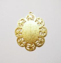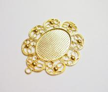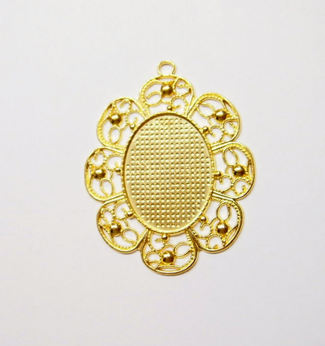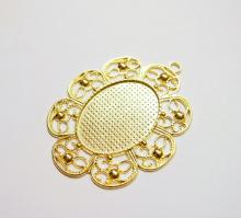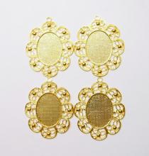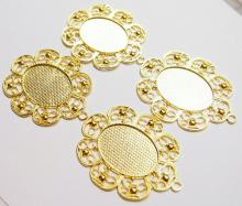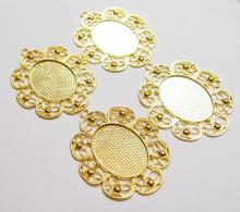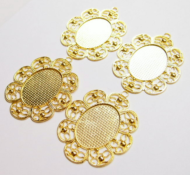You are buying 4 of 40 mm x 30 mm Shiny Gold Plated Flowered Pendant Settings. These settings are originally from the 1900-1930's, I only had a few left and found a company to make these for me and they are gorgeous. The design is just delicate, but they are very solid, not flimsy like the new ones are. These measure 75 x 60 mm including the loop (5 mm) at the top. You will not be disappointed in the quality, it is excellent and if I was setting any cameos or cabochons, I would use these. Since they are a solid back, you could go down in size a little if you had an odd size cameo or cab to try & fit. These will work great for any cameos or cabs, they will have to be glued in. I have lots of Great Bails, Bracelets, Cameos, Chains, Connectors, Jump Rings, Lockets, Pendants, Pins, Rings & Settings so, just look at all my listings.