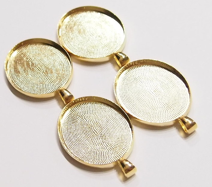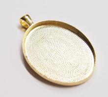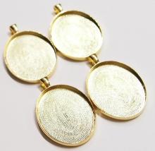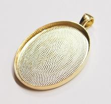 You are buying 4 of 40 mm x 30 mm Shiny Gold Plated Oval Deep Band Pendant Settings. The pendant has a simple design to show off the cameo or cab or whatever you put in it with a deep inset and the single band that goes around it. The top has a nice size loop (6.5 x 4.7 mm) for your Chain or Cord or Jump Ring (which I have 3 Colors & 2 Sizes of). You will not be disappointed in the quality, it is excellent and if I was setting any cameos or cabs, I would use these. These have never been used. These are made for 40 mm x 30 mm Cameos or Cabs. Since they are a solid back, you could go down in size a little if you had an odd size cameo or cab to try & fit. Everything is solidly made from the setting to the pendant bail. I have lots of Great Bails, Bracelets, Cameos, Chains, Connectors, Jump Rings, Lockets, Pendants, Pins, Rings & Settings so, just look at all my listings. I have these in 3 other Colors & in a group of 4 Colors as shown in the last picture item #112531883053 and are sold separately. I also have these in a 25 mm Round Setting, item #360478420745.