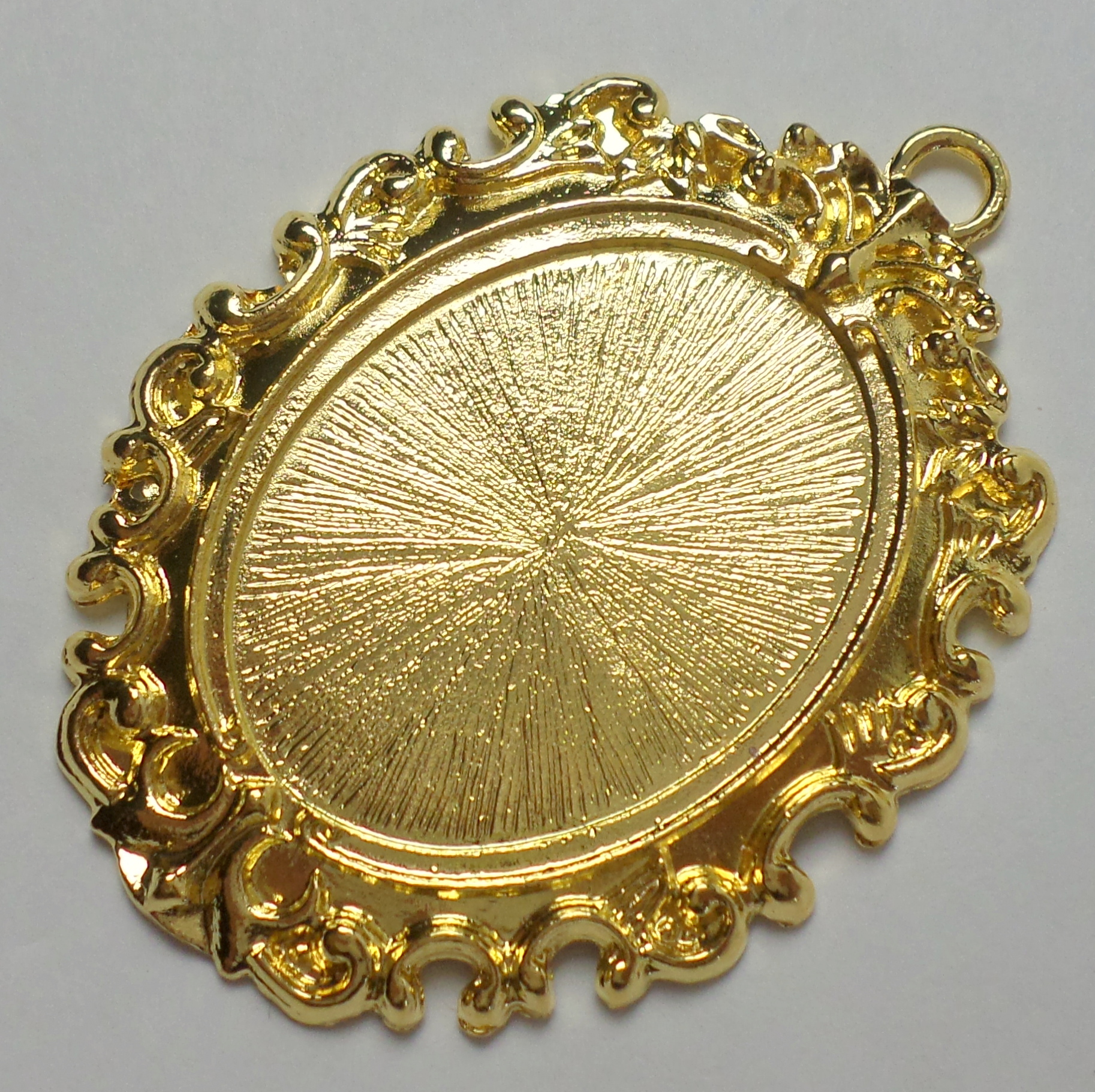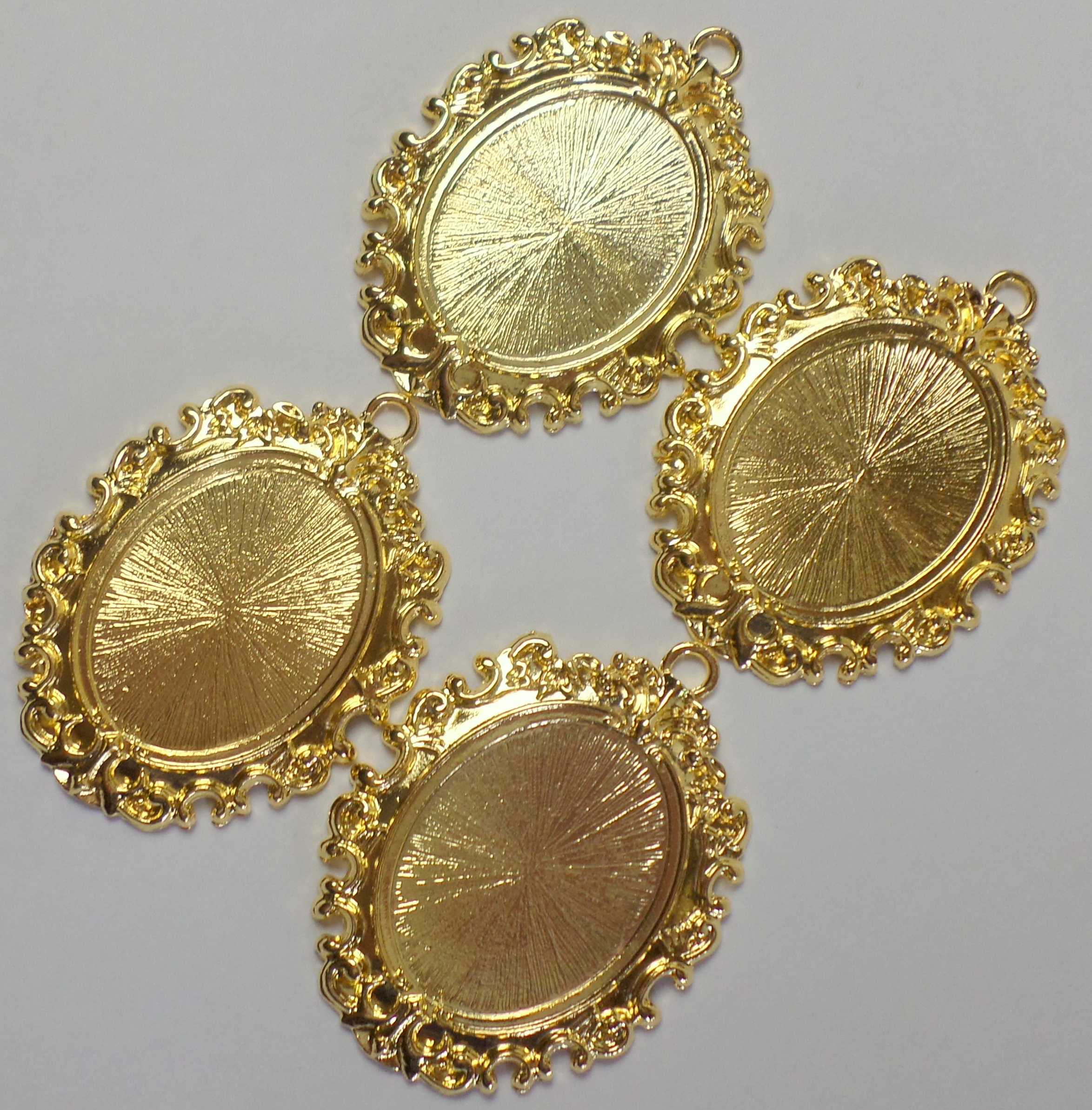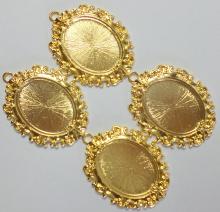 You are buying 4 of 40 mm x 30 mm Shiny Gold Plated Open Loops Renaissance style Pendant Settings. The outside measures 67 x 50 mm including the loop at the top. The top has a nice size loop (4.4 mm) for your Chain or Cord or Jump Ring (which I have 3 Colors & 2 Sizes of). These settings are originally from the 1900-1930's, I only had a few left and found a company to make these for me and they are gorgeous. Cameos, cabochons or glass will have to be glued in the settings, no prongs and they are very sturdy. The design is very pretty with an open loop that has a Renaissance style pattern all around the setting. These have never been used. Since they are a solid back, you could go down in size a little if you had an odd size cameo, cabochon, glass, or whatever you want to try & fit. They have a gorgeous Victorian look to them. You will not be disappointed in the quality, it is excellent and if I was setting any cameos or cabs, I would use these. I have lots of Great Bails, Bracelets, Cameos, Chains, Connectors, Jump Rings, Lockets, Pendants, Pins, Rings & Settings so, just look at all my listings. I have these in 3 other colors and in a group of all 4 colors as shown in the last picture, item #580829663292, sold separately.
