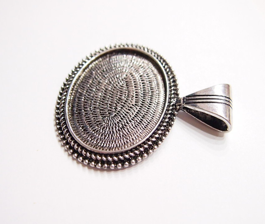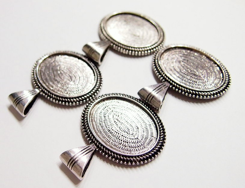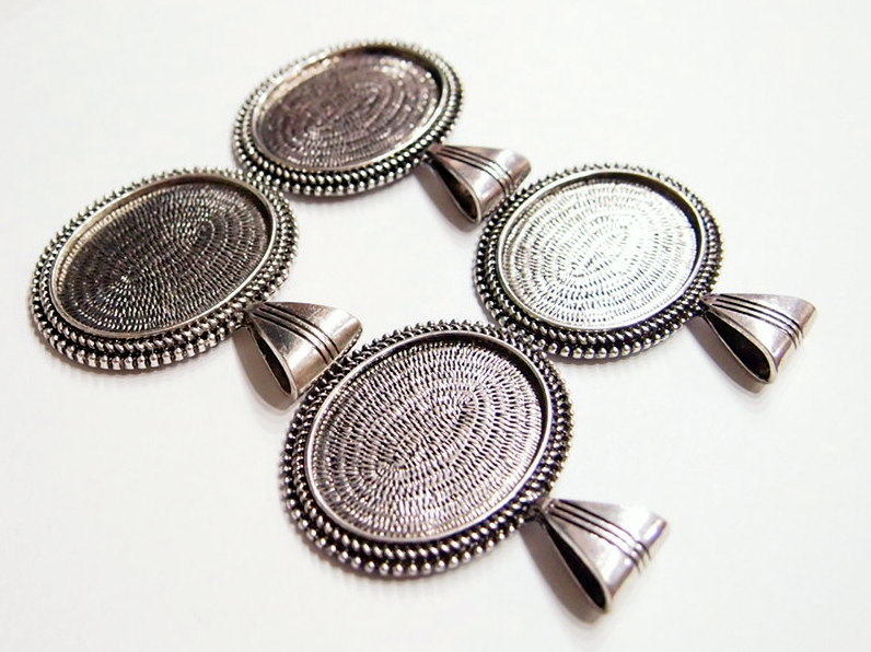 You are buying 4 of 40 mm x 30 mm Horizontal Antique Silver Beaded Edge Pendant Settings. These horizontal pendant settings have a double row of beaded rope all around the edge. These are a solid, sturdy and well made pendant setting for a horizontal 40 mm x 30 mm. These also have a nice size bail for your chains or cords to go through. You will not be disappointed in the quality, it is excellent and if I was setting any cameos, cabochons, or glass, I would use these. Since they are a solid back, you could go down in size a little if you had an odd size cameo or cabochon to try & fit. Everything is solidly made from the setting to the pendant bail. I have lots of Great Bails, Bracelets, Cameos, Chains, Connectors, Jump Rings, Lockets, Pendants, Pins, Rings & Settings so, just look at all my listings. I have several styles of Horizontal Cameos that will look great in these very nice looking settings. I also offer these in Antique Gold item #362368485843, as shown in the next to last picture, sold separately. These are also offered in a group of 10 different Antique Silver 40x30 mm settings item #360944312815 as shown in the last picture, sold separately.