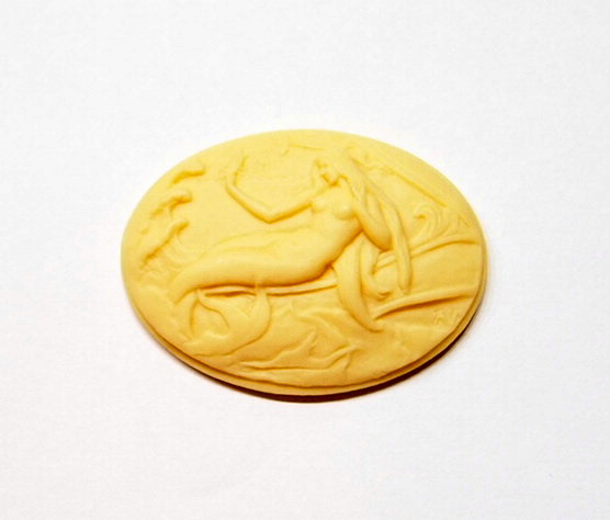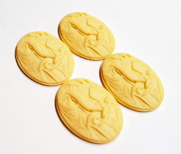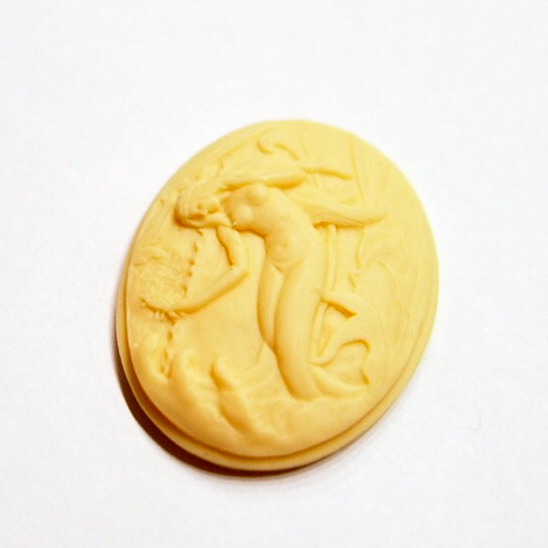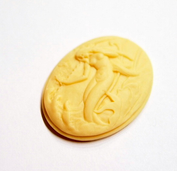 You are buying 4 of 40 mm x 30 mm Horizontal Cream Color Single Mermaid on the Rocks Cameos. These are so gorgeous, this shows a beautiful Single Mermaid on the Rocks in the Ocean, just too pretty in a Cream color on a background of Cream. What I like about the same color cameos is that you can use a little acrylic nail polish or paint and decorate these anyway you want to, make them stand out and have a one of a kind cameo, no one else has. All my cameos have never been used. The molding process of these are just great, no flaws. I have several different settings these will fit in. These are pretty fabulous. They measure 40 mm x 30 mm. They look very detailed for their size.I have lots of Great Bails, Bracelets, Cameos, Chains, Connectors, Jump Rings, Lockets, Pendants, Pins, Rings & Settings so, just look at all my listings. I have this same Cameo in 25x18 & several Colors in both sizes.