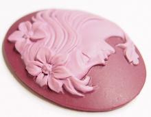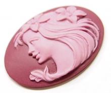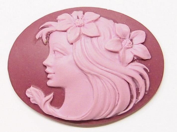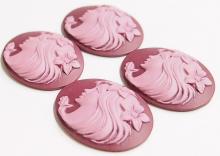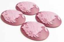 You are buying 4 Vintage Molded Resin Cameos. They are of a Beautiful Horizontal Young Woman facing Left with flowers in her hair. The girl is Light Plum on a Dark Plum color background. These measure 40 mm x 30 mm. The molding process of these are just great, no flaws. I have several different settings these will fit in. These are pretty fabulous. They look very detailed for their size. I have lots of great cameos, settings, connectors and pendants so, just look at all my listings.