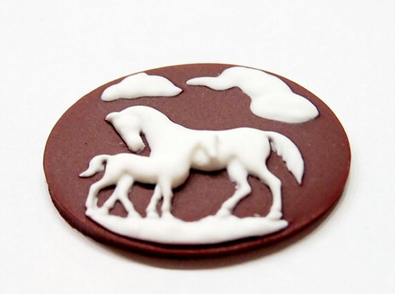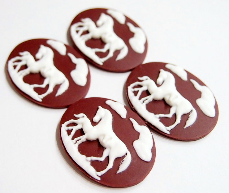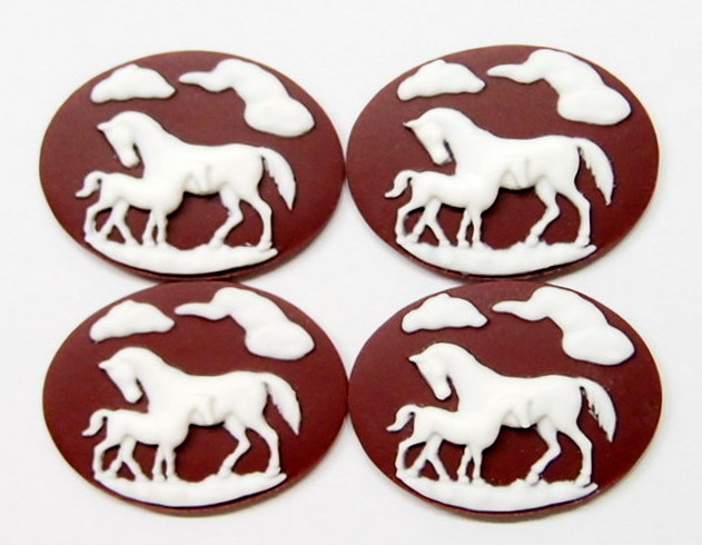 You are buying 4 of 40 mm x 30 mm Horizontal White over Brown Horse & Colt Cameos. These are of a Beautiful Female (Mare) or (Stud) Horse with baby Colt standing beside, these are molded. The images stand out from the cameo to give them the 3-d effect. They are a White color on a Brown background. They measure 40 mm x 30 mm & are Horizontal in orientation. They look very detailed for their size. I have lots of Great Bails, Bracelets, Cameos, Chains, Connectors, Jump Rings, Lockets, Pendants, Pins, Rings & Settings so, just look at all my listings. I have these in 3 other colors and are included in a group of 8 different colors of 40x30 mm horse cameos item # 360471676540 as shown in the next to last picture, sold separately. I also have a group of Horses in 6 different colors of 25x18 mm as shown in the last picture item #360471679672 sold separately.