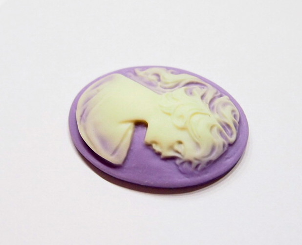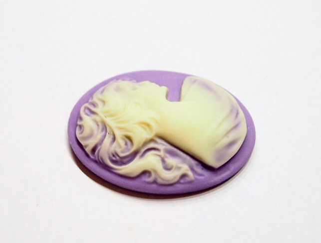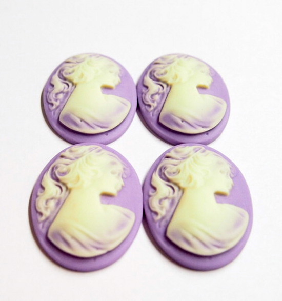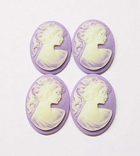 You are buying 4 of 40 mm x 30 mm Ivory over Light Purple Ponytail Women Cameos. They are of a Beautiful Victorian Woman with a ponytail facing right, these are molded. The images stand out from the cameo to give you the 3-d effect. They are a Ivory color to a Light Purple background. They measure 40 mm x 30 mm. They look very detailed for their size. I have lots of Great Bails, Bracelets, Cameos, Chains, Connectors, Jump Rings, Lockets, Pendants, Pins, Rings & Settings so, just look at all my listings. These are also offered in a group of 10 Colors as shown in the last picture item #360600704578. I offer lots of other Cameos like this and in groups so give them all a look.
