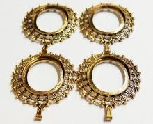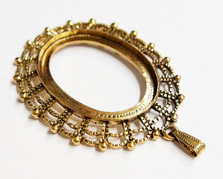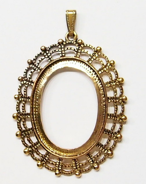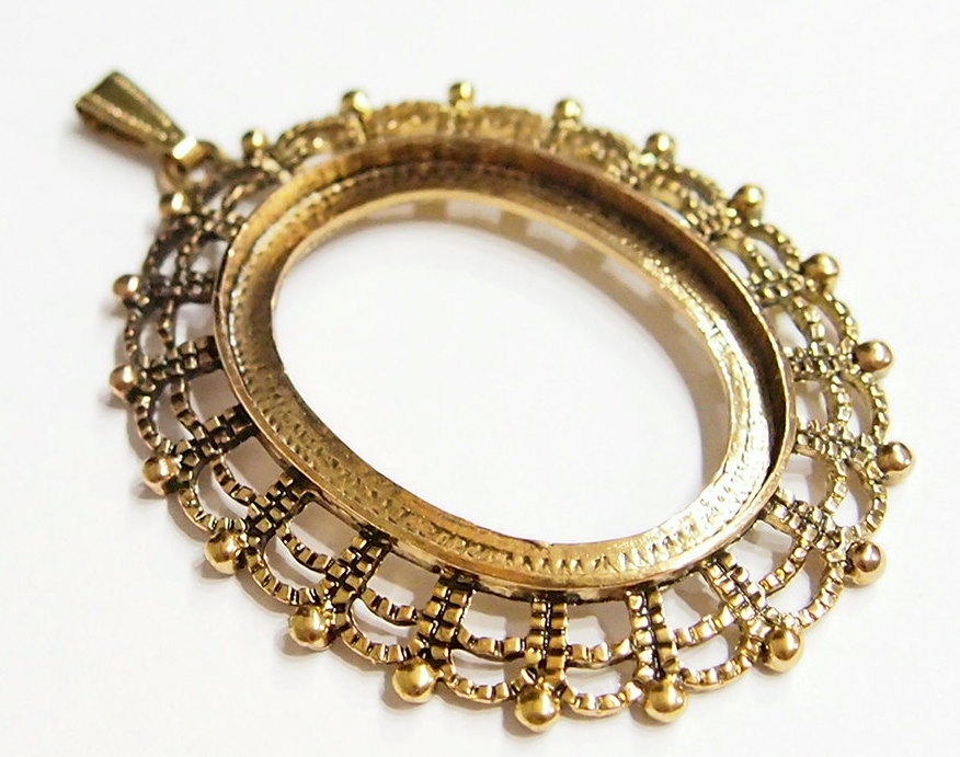 You are buying 4 of 40 mm x 30 mm Oval Antique Gold Plated Lacy Pendant Settings. You will not be disappointed in the quality, it is excellent and if I was setting any cameos or cabochons, I would use these. These are much sturdier than the other ones you will find that looks exactly like this, I had these made. The pendant comes down from the top into a gorgeous woven pattern that flares out from where the cab or cameo will be set and will accent any cabs or cameos you have to put in it. These have never been used. These are exactly made for 40 mm x 30 mm, no other size will fit. Everything is solidly made from the setting to the pendant bail. They have a gorgeous Victorian look to them. I have lots of Great Bails, Bracelets, Cameos, Chains, Connectors, Jump Rings, Lockets, Pendants, Pins, Rings & Settings so, just look at all my listings. I have these in 3 other Colors & in a group of 4 Colors as shown in the next to last picture item #111392559827 and are sold separately. I also have these in 25x18 mm item #110911253392 and a group of 4 Colors item #111371045806 also sold separately. These are also offered in a group of 9 different Antique Gold Art Deco Brooch Pin or Pendant settings item #112175736245 as shown in the last picture, sold separately.