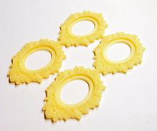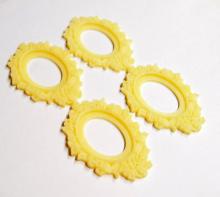 You are buying 4 of 40 mm x 30 mm Pale Yellow Rose Pattern Acrylic Pendant Settings. These have a hole at the top for a jump ring(which I have 3 Colors & 2 Sizes of) or Pinch Bail which I have 3 Sizes & 2 Colors of. This is injection molded, made of acrylic, and is very light weight. You can always add a pin on the back if you desire a broach too. This setting is really gorgeous, and has rose bouquets all around the edge of the setting. These have never been used, very nice looking and a lot lighter than the metal pendant settings. I have lots of Great Bails, Bracelets, Cameos, Chains, Connectors, Jump Rings, Lockets, Pendants, Pins, Rings & Settings so, just look at all my listings. I have these in 1 other Color & in a group of 2 Colors as shown in the last picture. I also have this same material in 2 Colors of 25x18 mm settings with a different but really nice pattern. I have this same setting in 4 Colors and 3 sizes of metal.